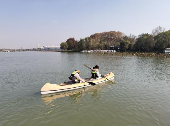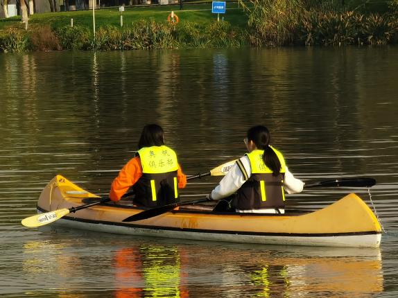 帆船实践过后,学员们在教练的指导下两两组队登上了皮划艇。与帆船运动不同的是,皮划艇与水面更为接近,更考验同学们的心理素质,但学员们迅速进行了自我调适,克服了恐惧心理,很快便体悟到 “一叶扁舟波万顷”的乐趣。