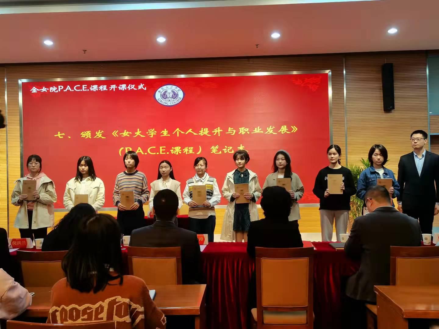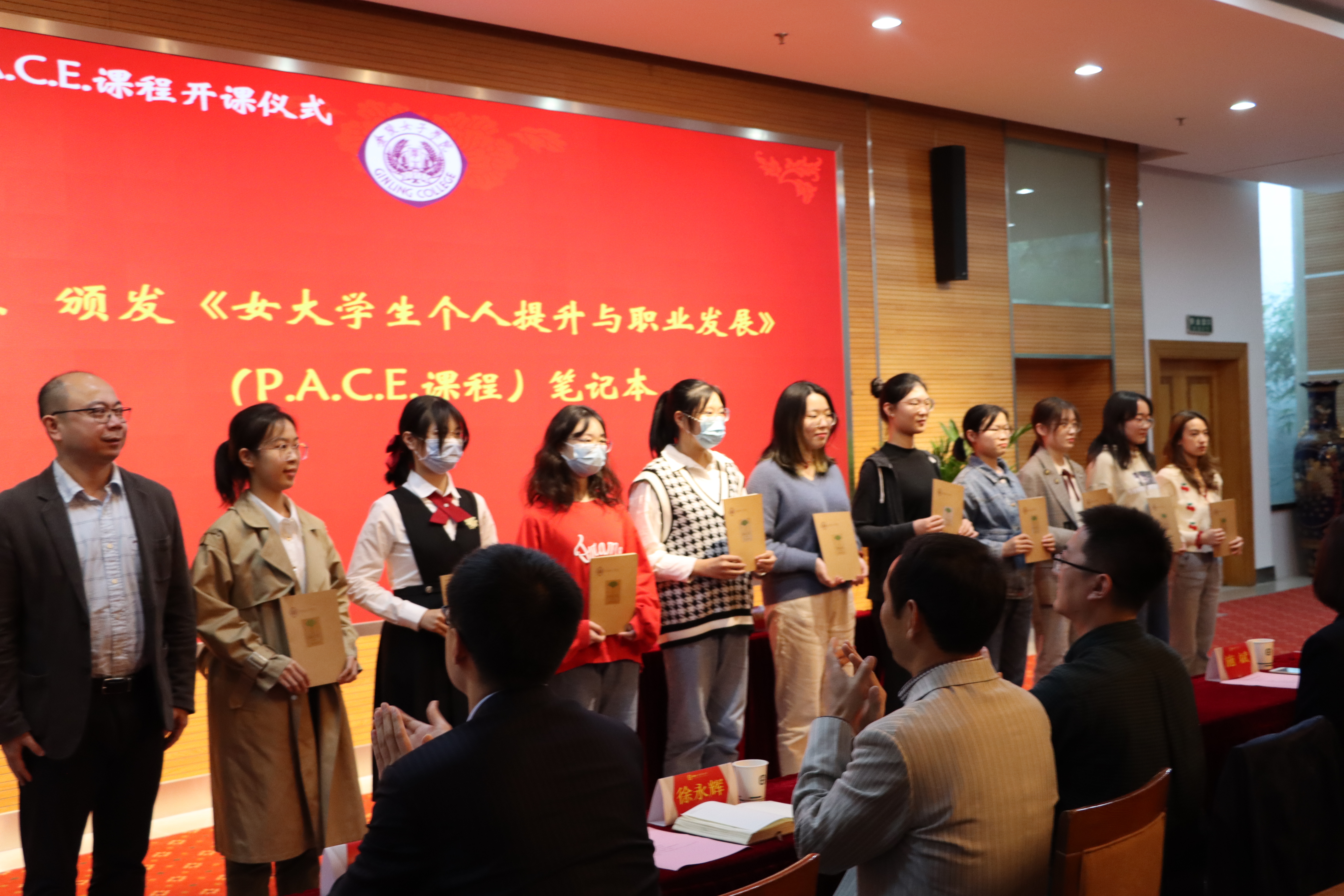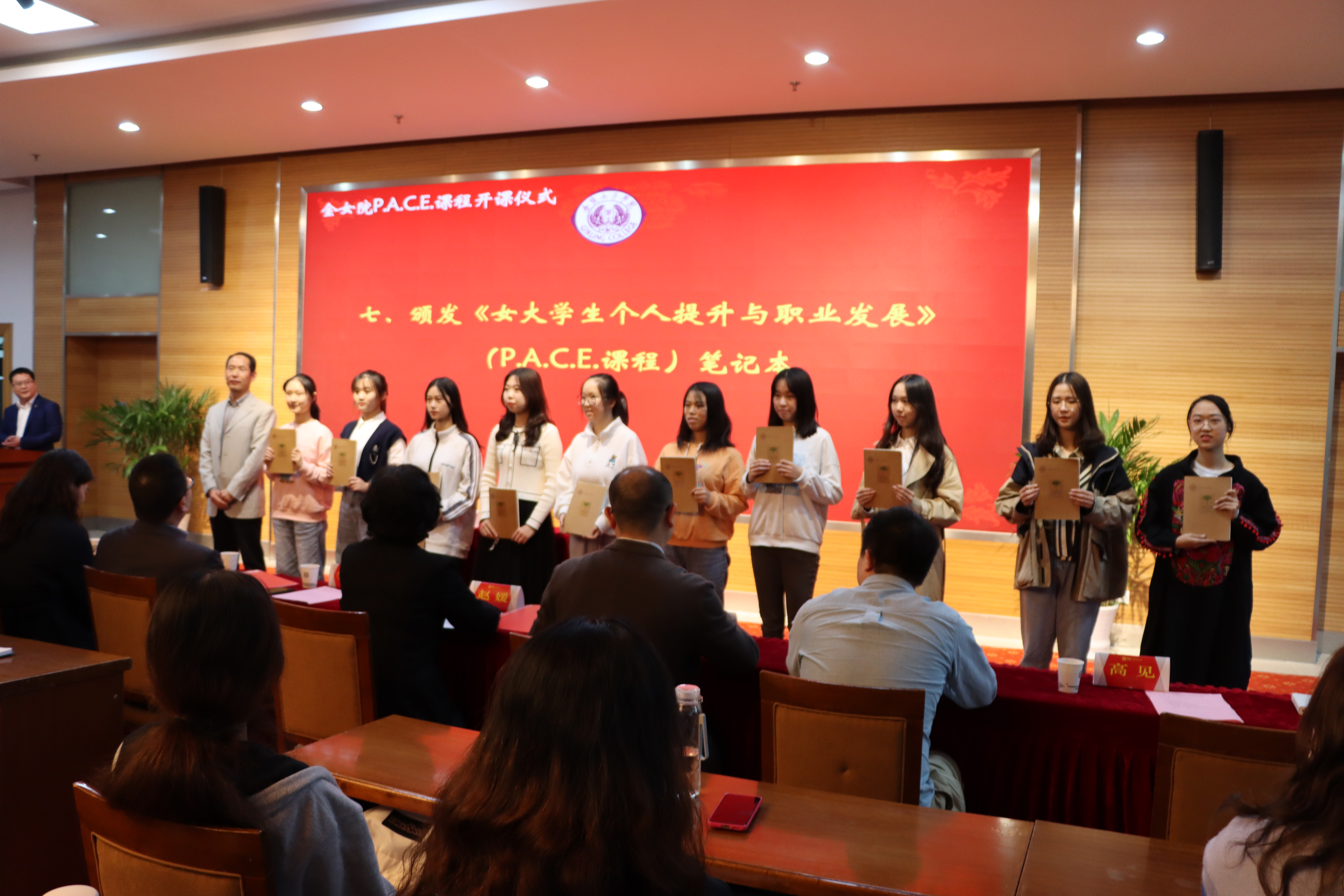 最后,校教务处副处长徐永辉、校学生工作处(部)副处(部)长蔡炳锋、校团委副书记刘立为给三期学员颁发书院特色课程《女大学生个人提升与职业发展》(P.A.C.E.课程)的笔记本,期待她们在未来学习生活中的优秀表现。