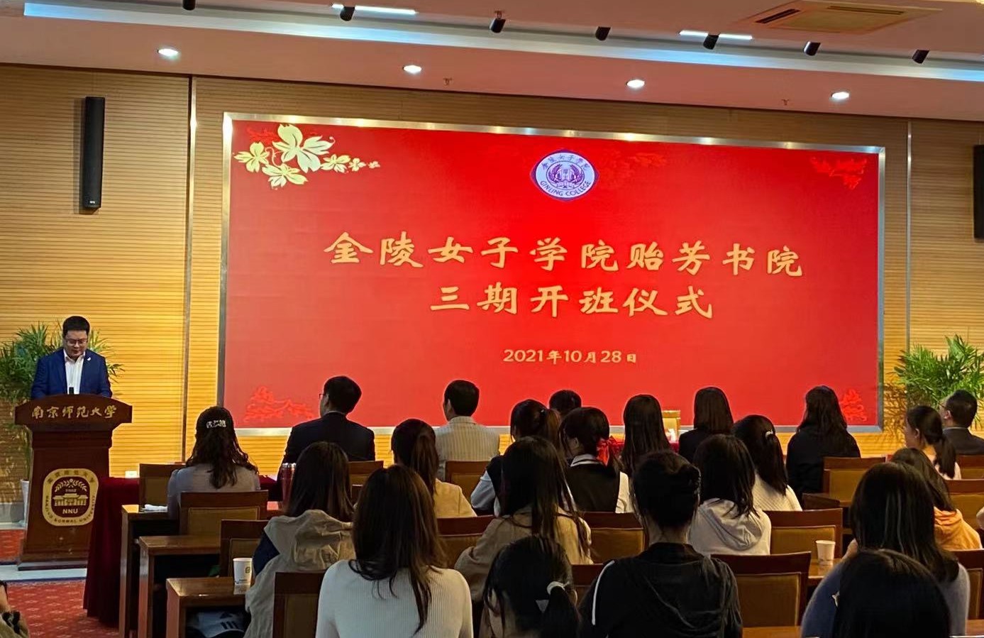 “贻芳书院”三期开班仪式于芳菲楼一楼会议厅成功举办。江苏省妇联干部学院院长施斌,省社区发展研究会会长、省委党校教授倪洪兰,朗阁教育集团副总裁李万涛,校教务处副处长徐永辉,校学生工作处(部)副处(部)长蔡炳锋,校团委副书记刘立为,博彩网址大全