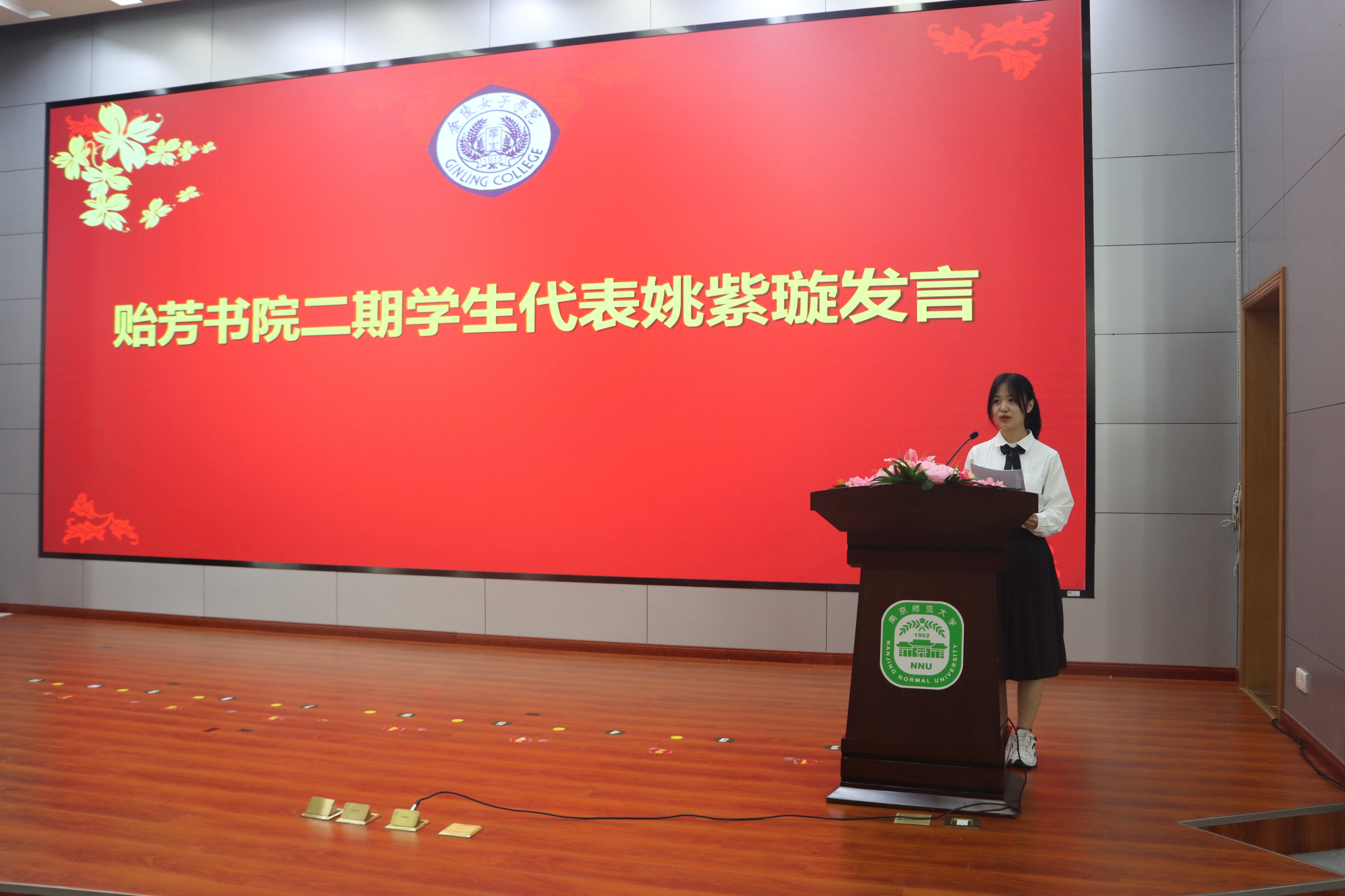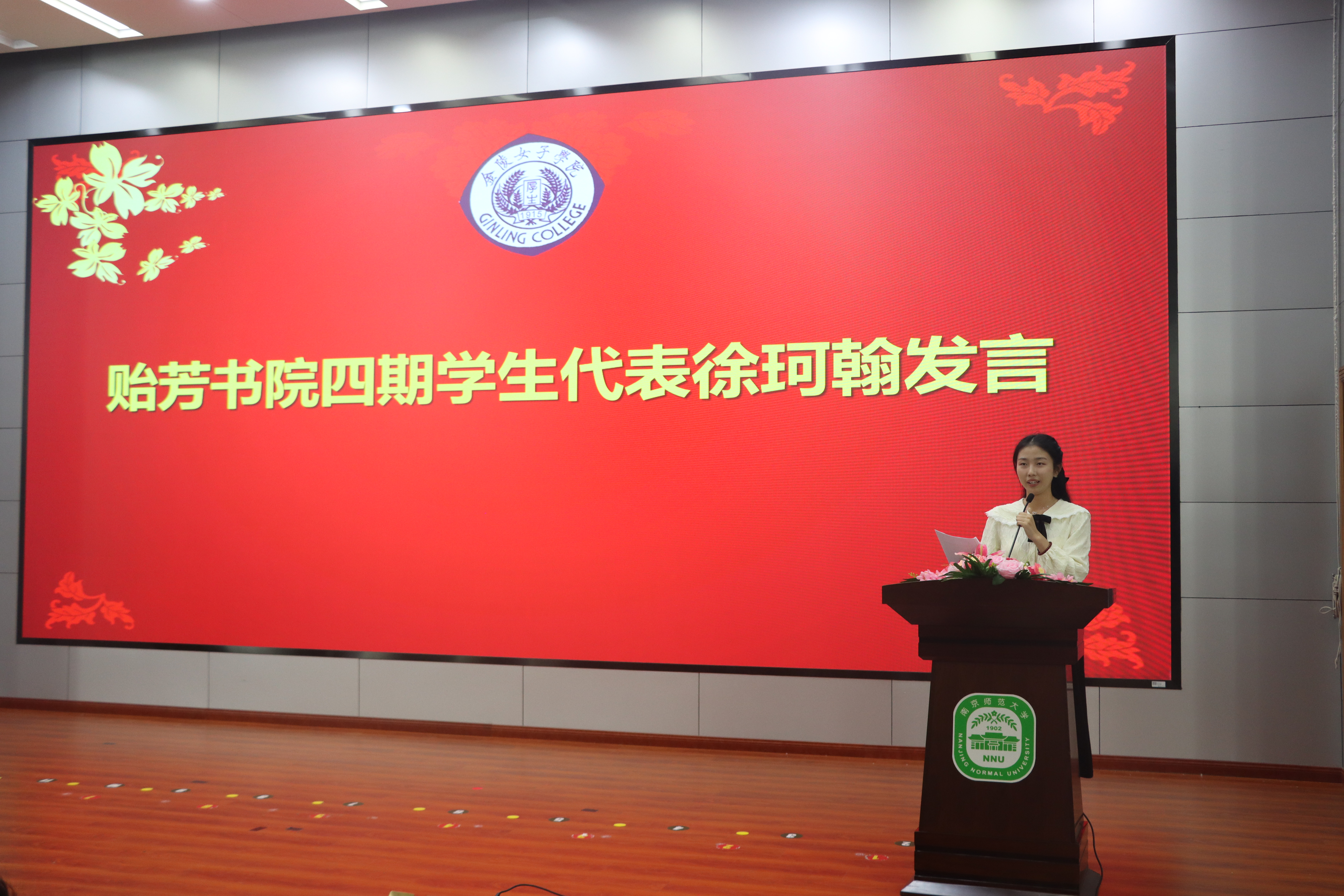 书院二期学员代表姚紫璇、四期学员代表徐珂翰分别发言。姚紫璇同学从贻芳书院对自身的影响谈起,讲述了书院多样化课程带给她的收获,随后深情寄语学弟学妹:希望大家可以秉承厚生校训,传承金女大九百九十九朵玫瑰之风采,向金女大杰出女性们学习,为民族复兴伟业贡献女性力量,展现新时代青年的青春担当。徐珂翰同学则从博彩网址大全