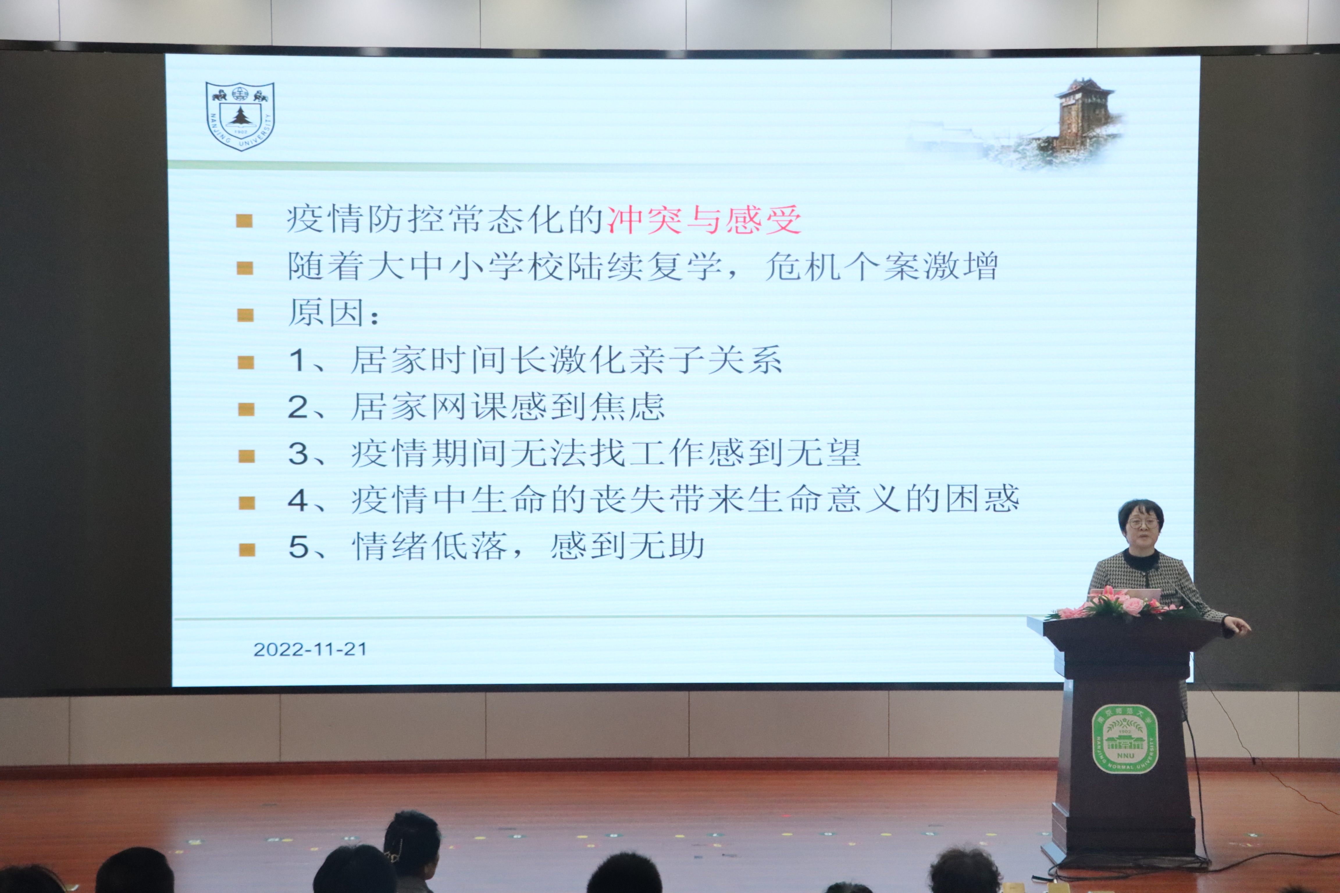 随后,桑教授着重讲解了“如何应对个人危机”。危机是指个体面临突然或重大生活逆境时所表现的心理失衡状态,人从出生以来就存在个人危机,因此寻找正确的应对方法十分重要。她通过弹簧的例子,告知同学们无论何时都要有将弹簧反弹回去的“应对能力”,否则身体就会出现失序状态。桑教授还提到,现今大学生主要出现的危机有情境性危机、发展性危机和存在性危机,心怀理想可以帮助大家脱离危机,避免大家沉湎于社会的诱惑之中。