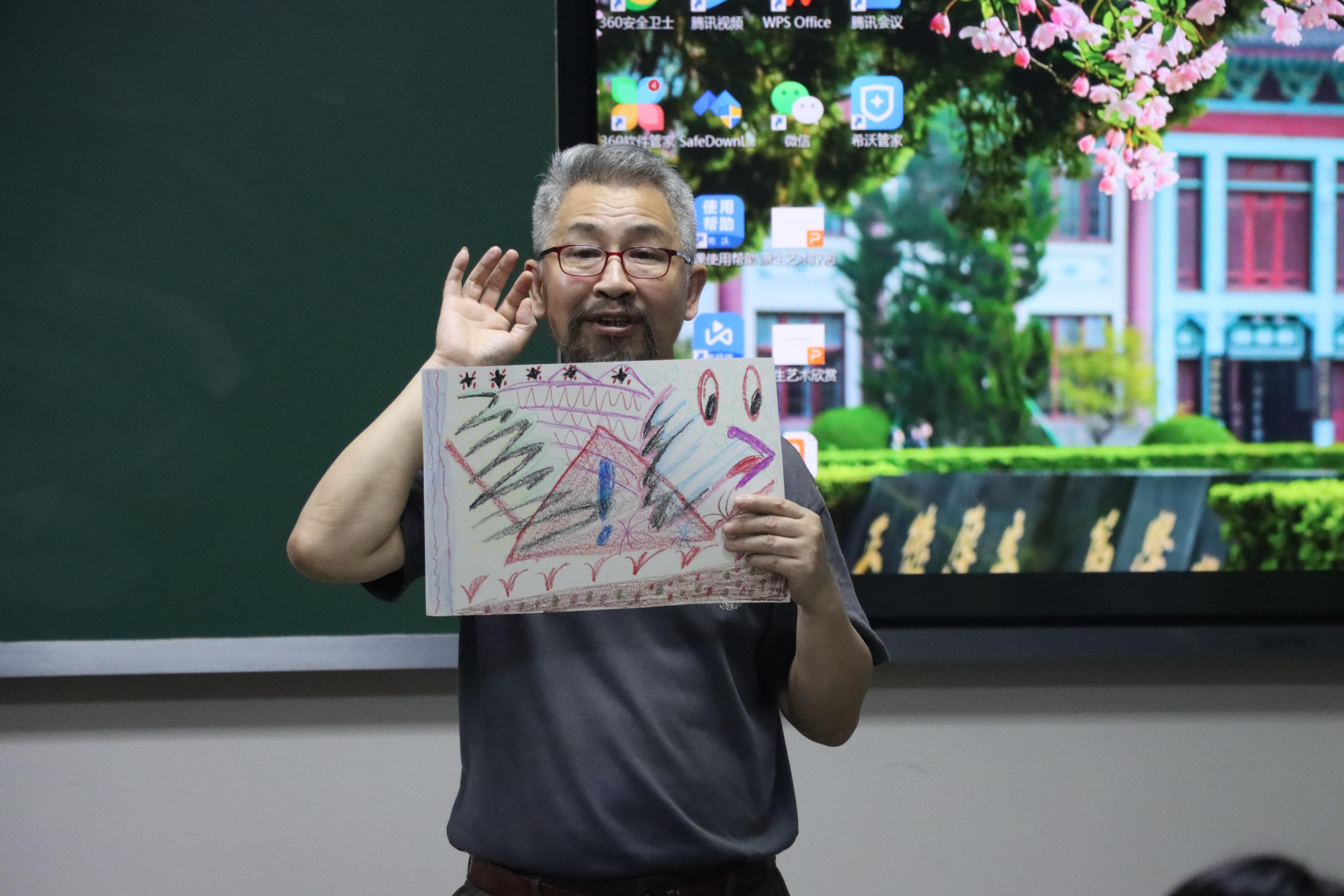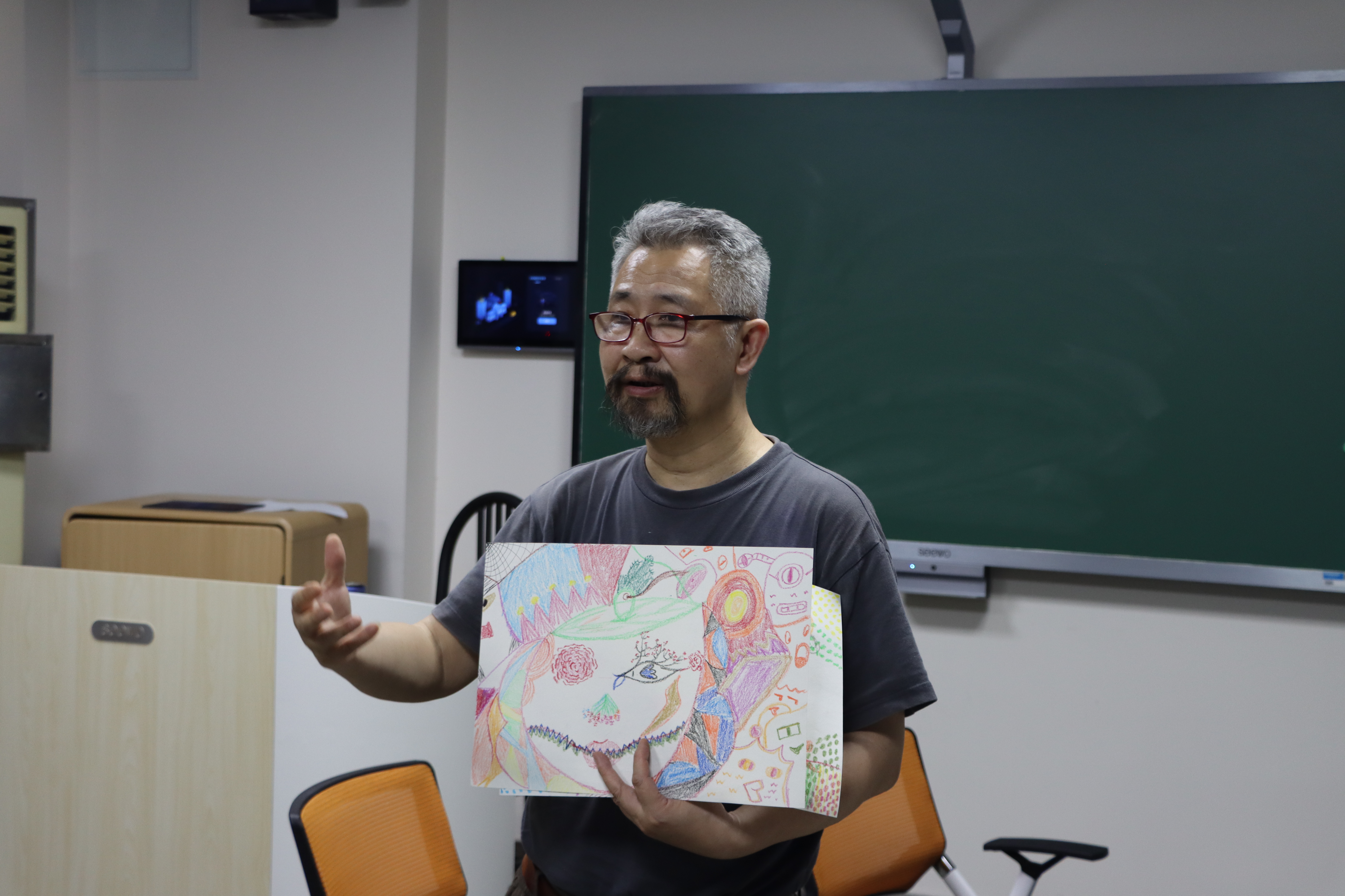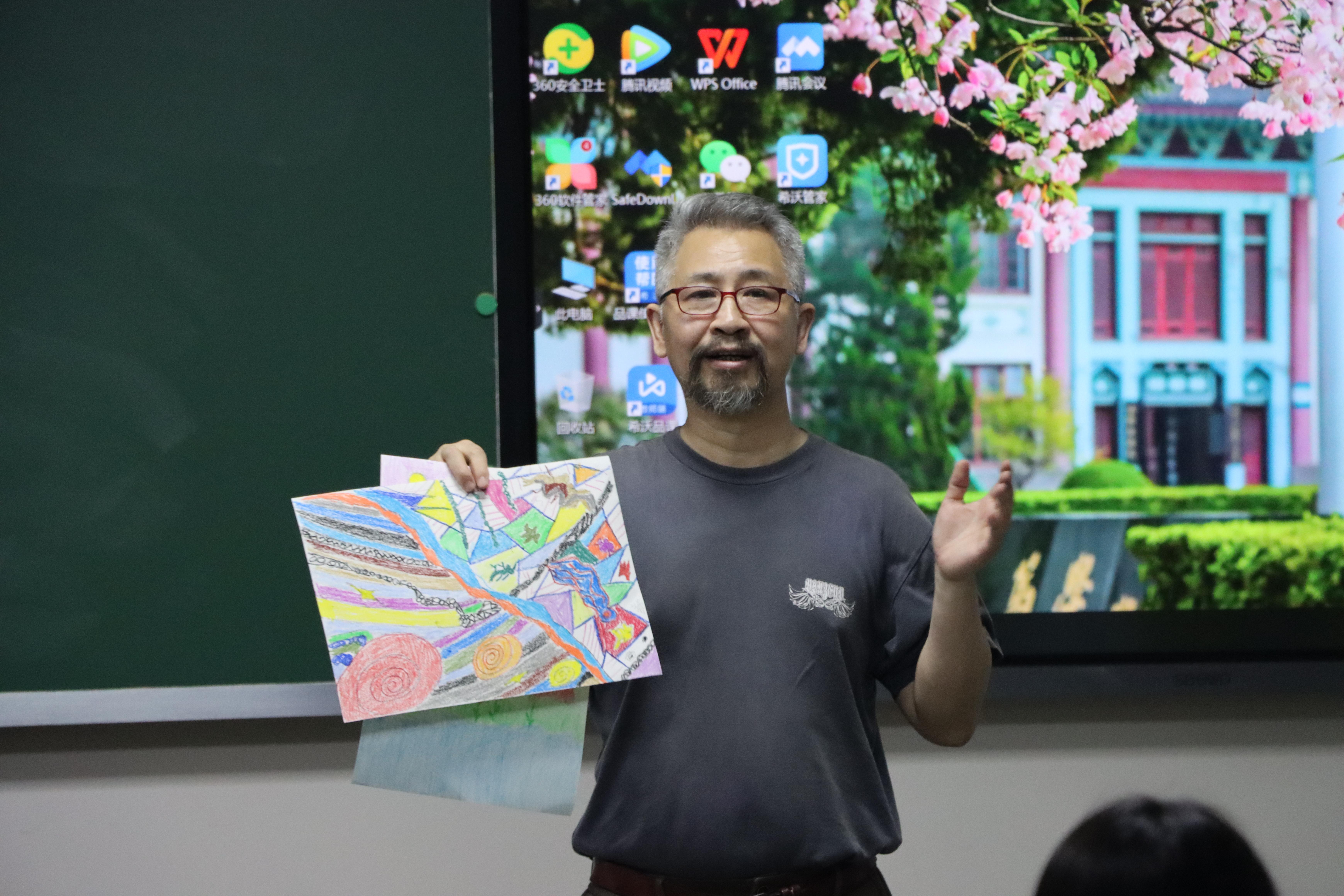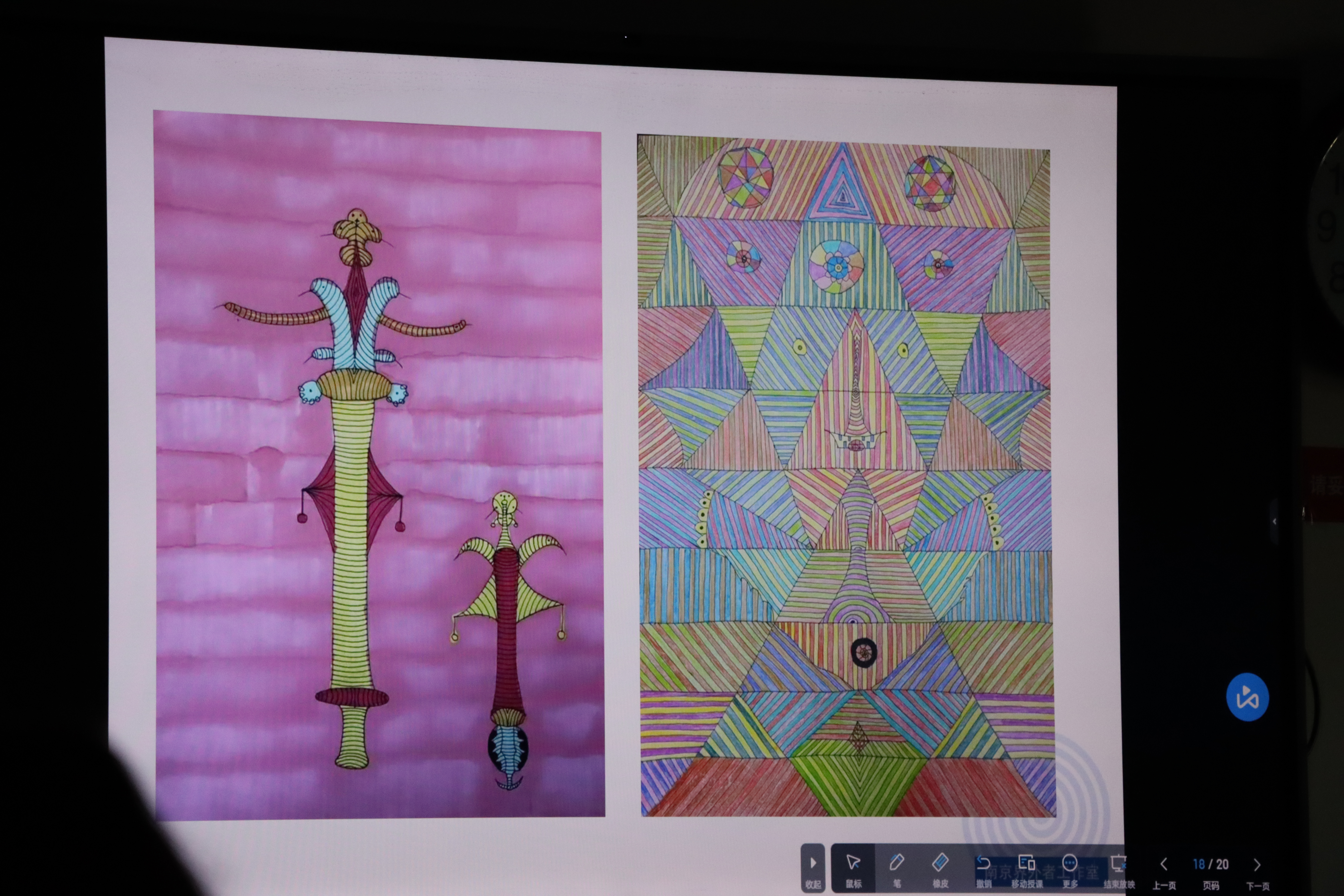 活动伊始,郭海平老师从“原生艺术与自我疗愈”的主题出发,通过事例分享、中西对照、作品分享加深了同学们对原生艺术的认识与理解。随后,在作品分享阶段,郭海平老师讲述了每张艺术作品背后的故事,并对这些创作者的内心表达进行了相关分析,强调激发原生艺术潜能的重要性。接着郭老师与学生们分享了如何进入“非思”、“无知”的状态,随心所欲地进行创作。随后,郭老师倡导大家无需借鉴经验,在自己潜意识和身心的引导下进入原生艺术的创作状态。