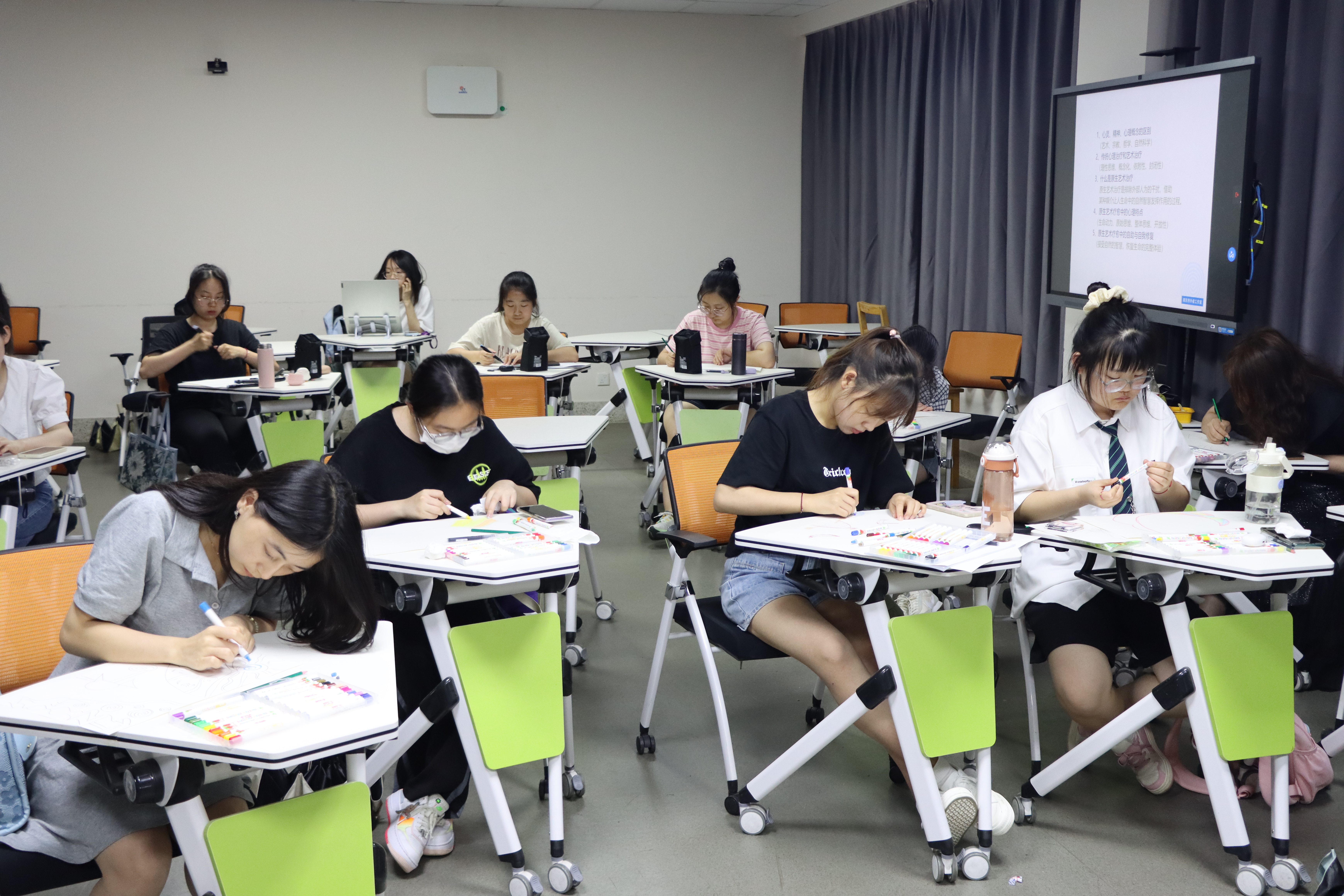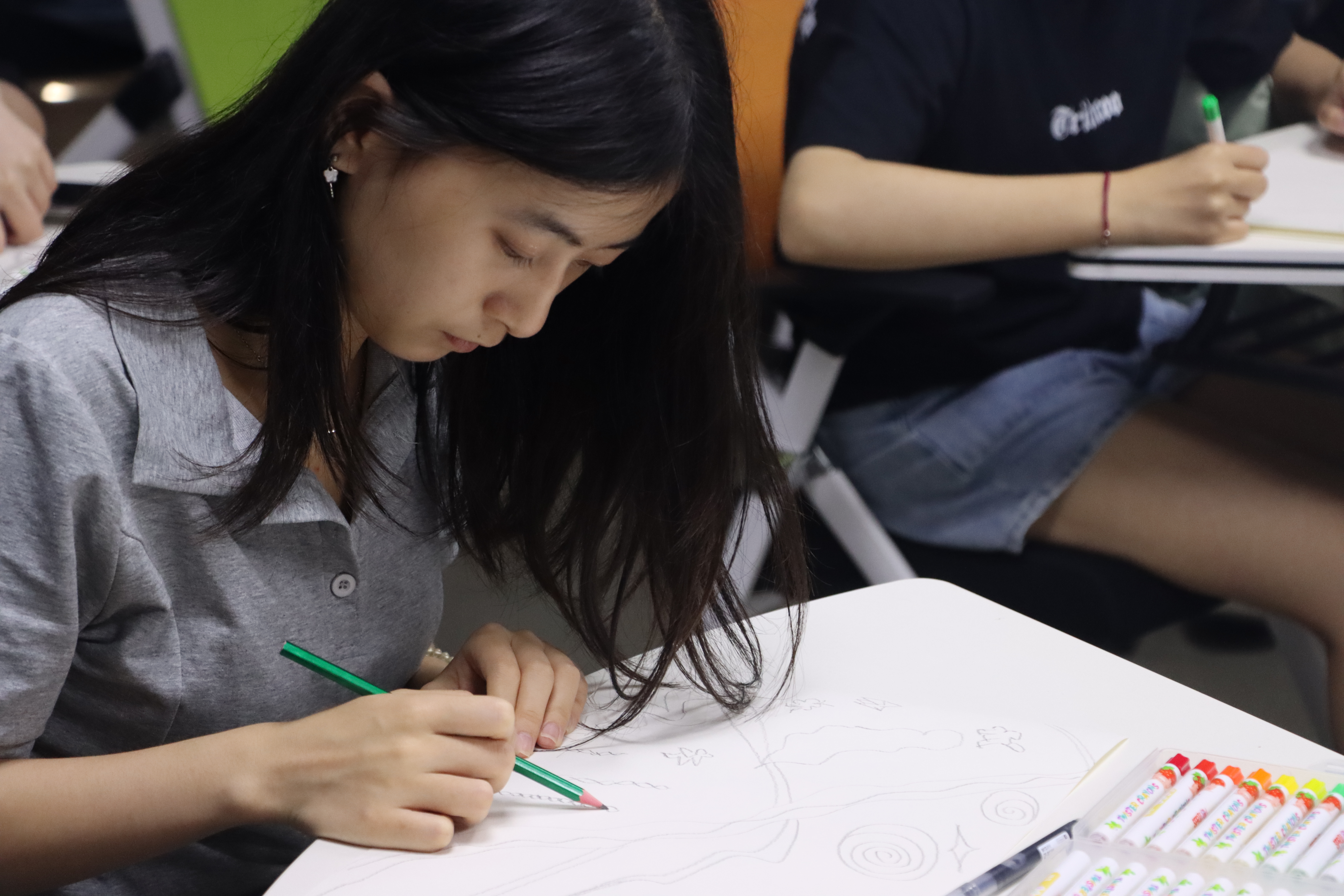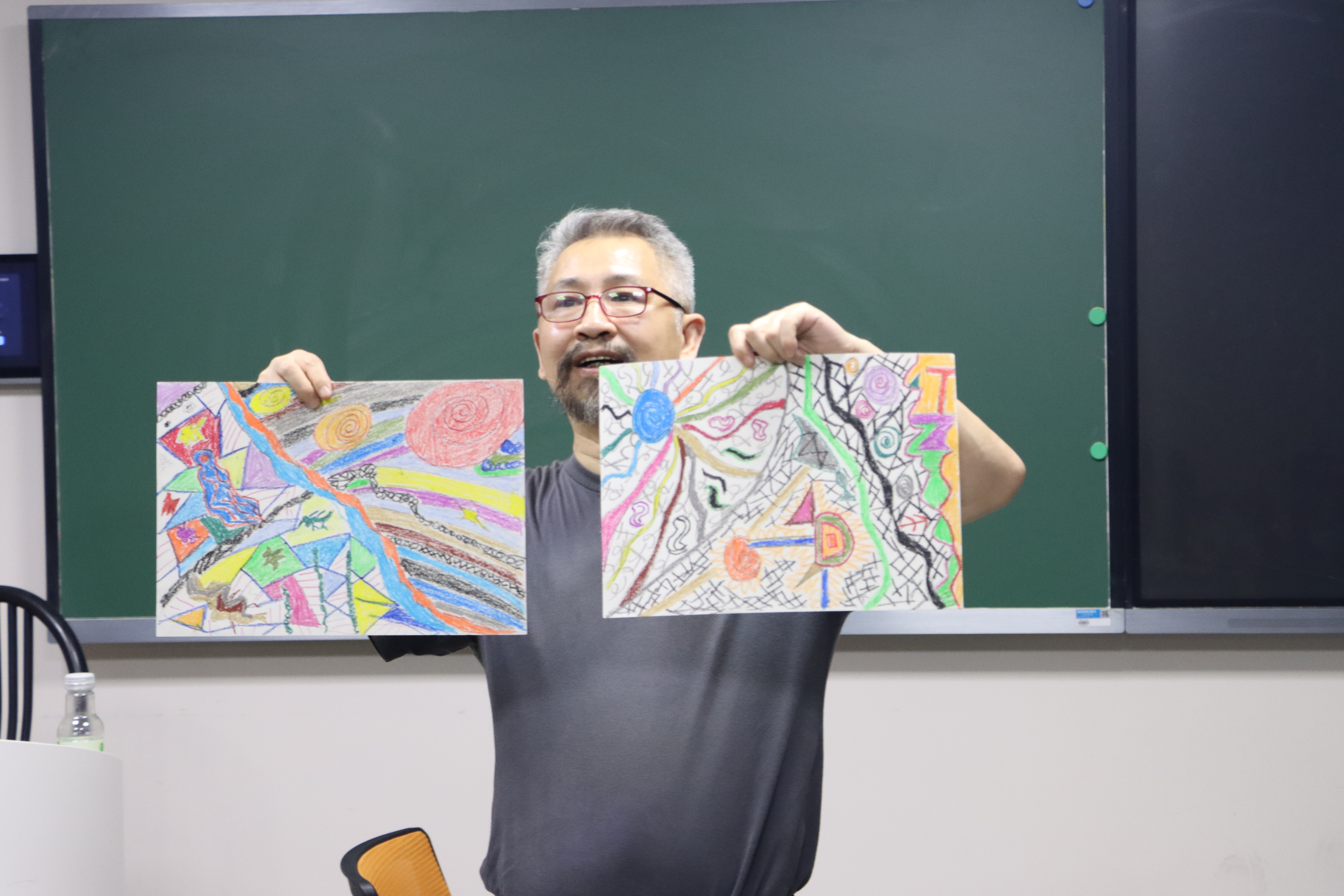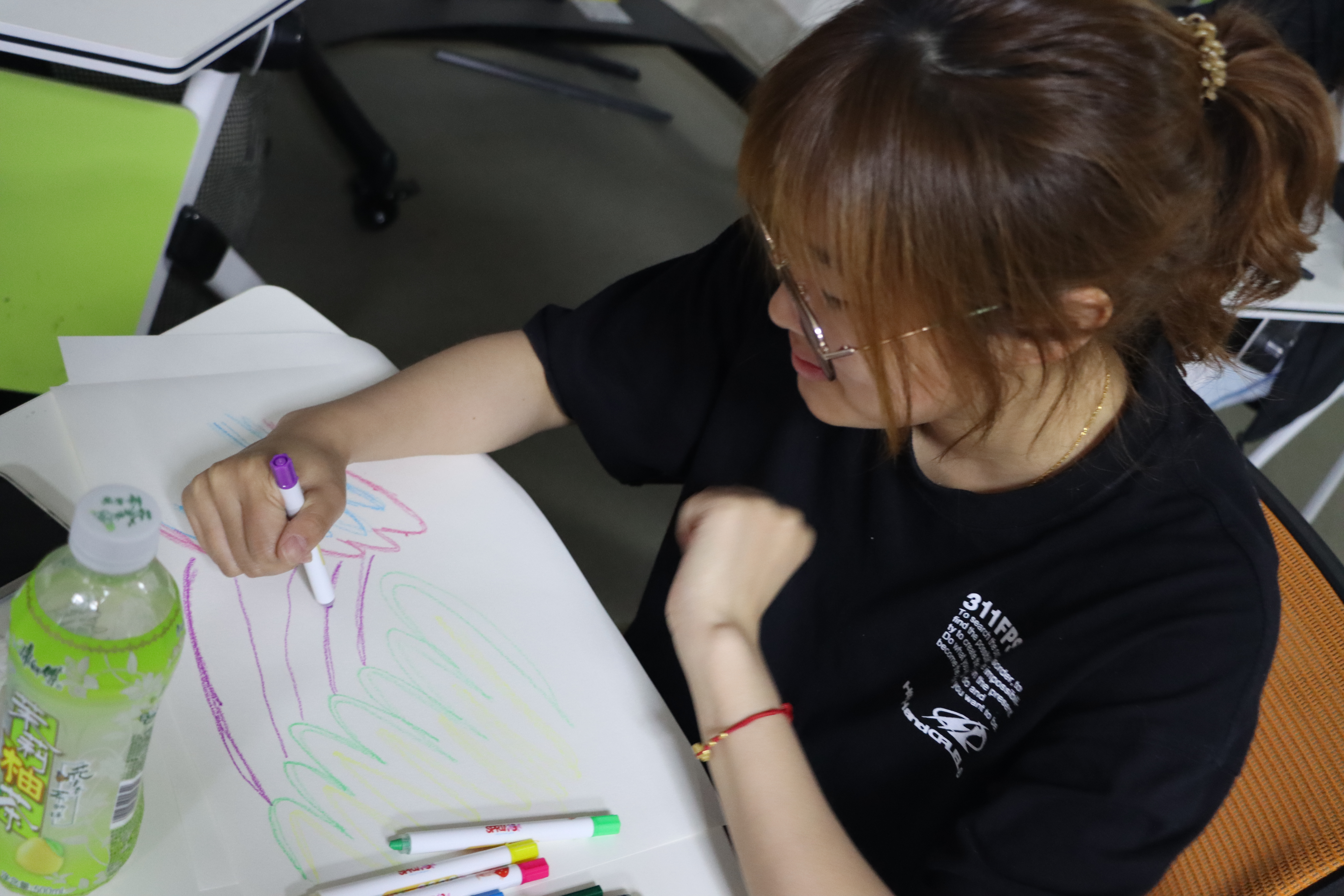 接着,郭海平老师让全体成员进行第二轮的创作。他希望大家放空思想,合理使用马克笔、油画棒等画图工具,不带任何情感和想法地画出自己内心想要的图案。