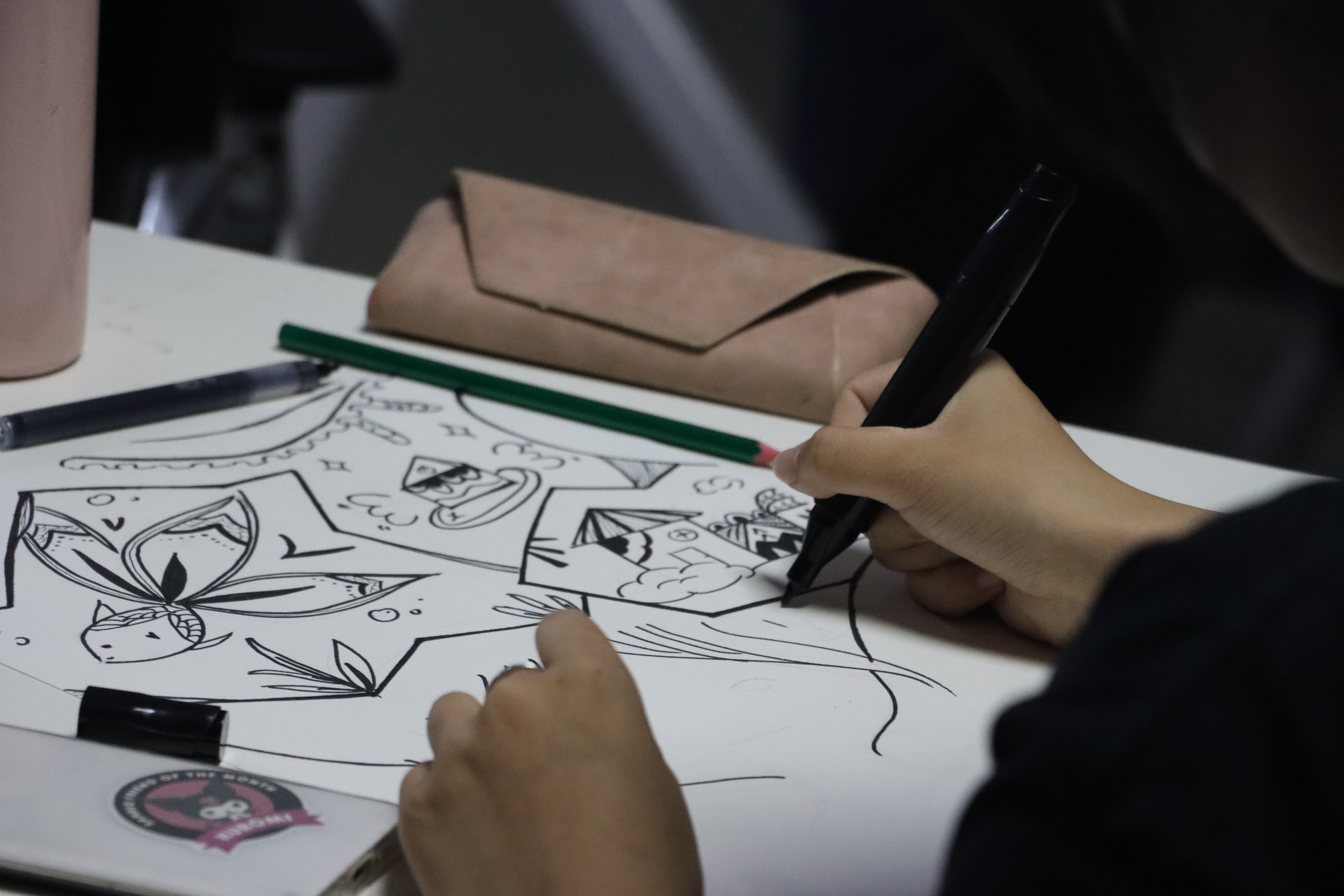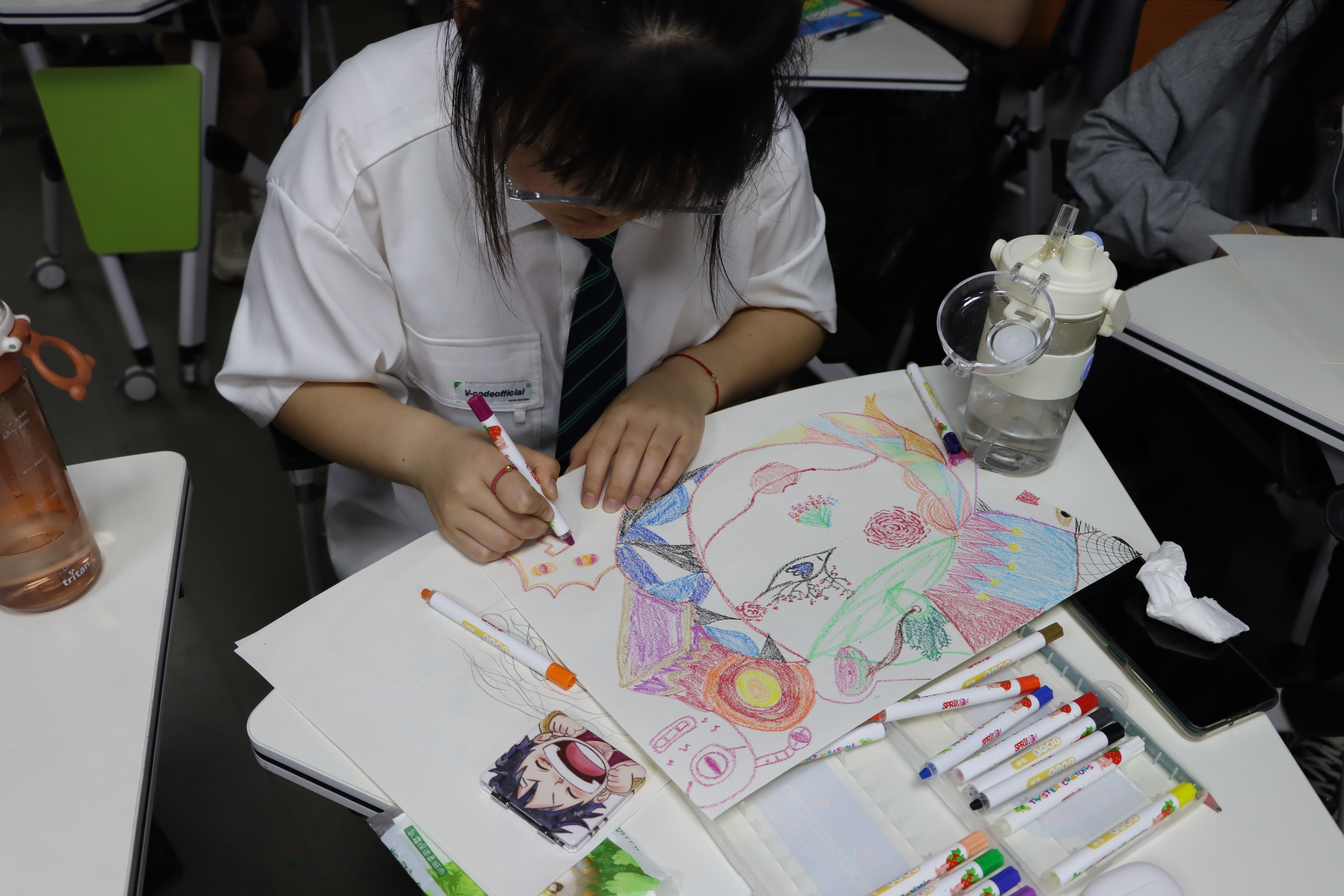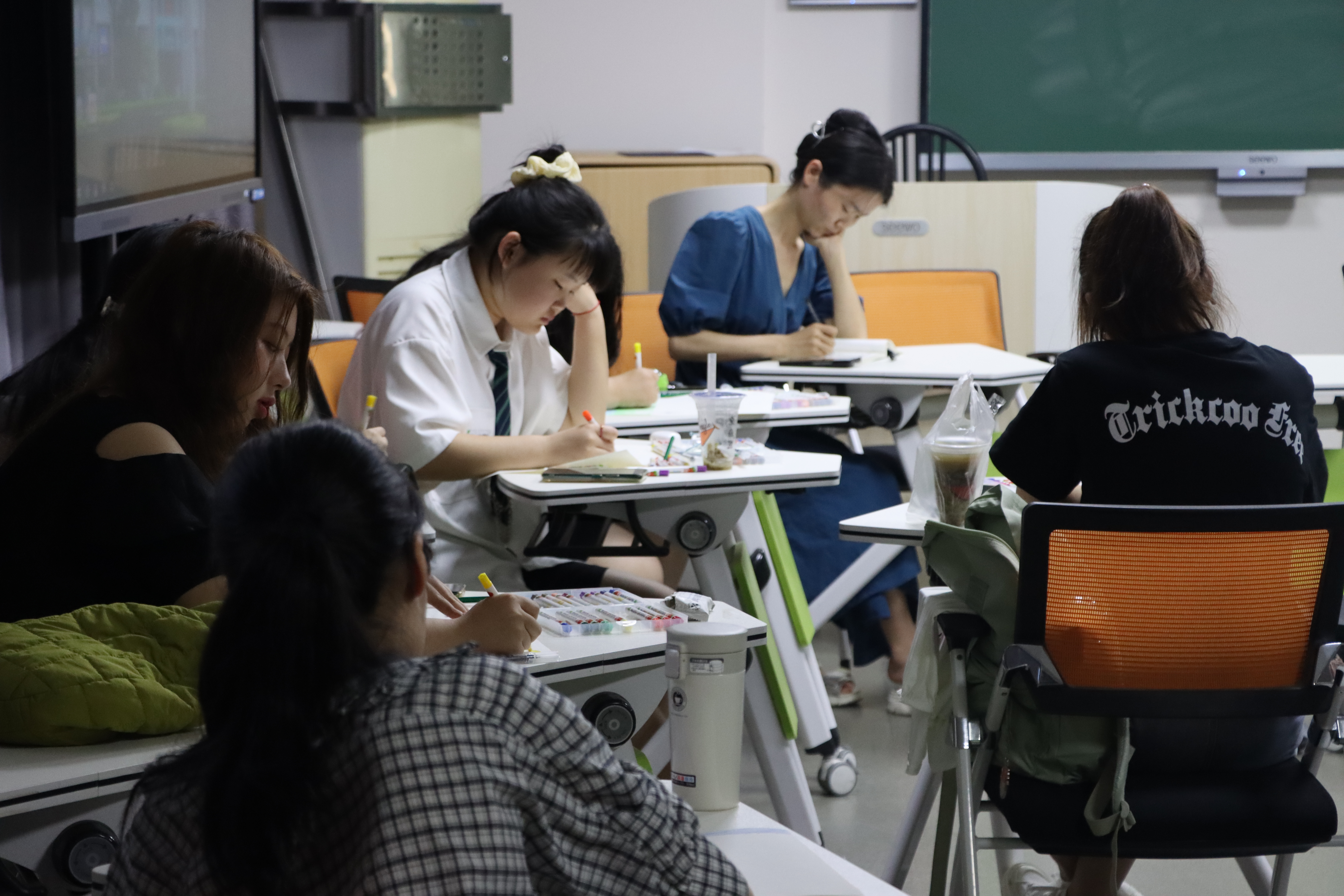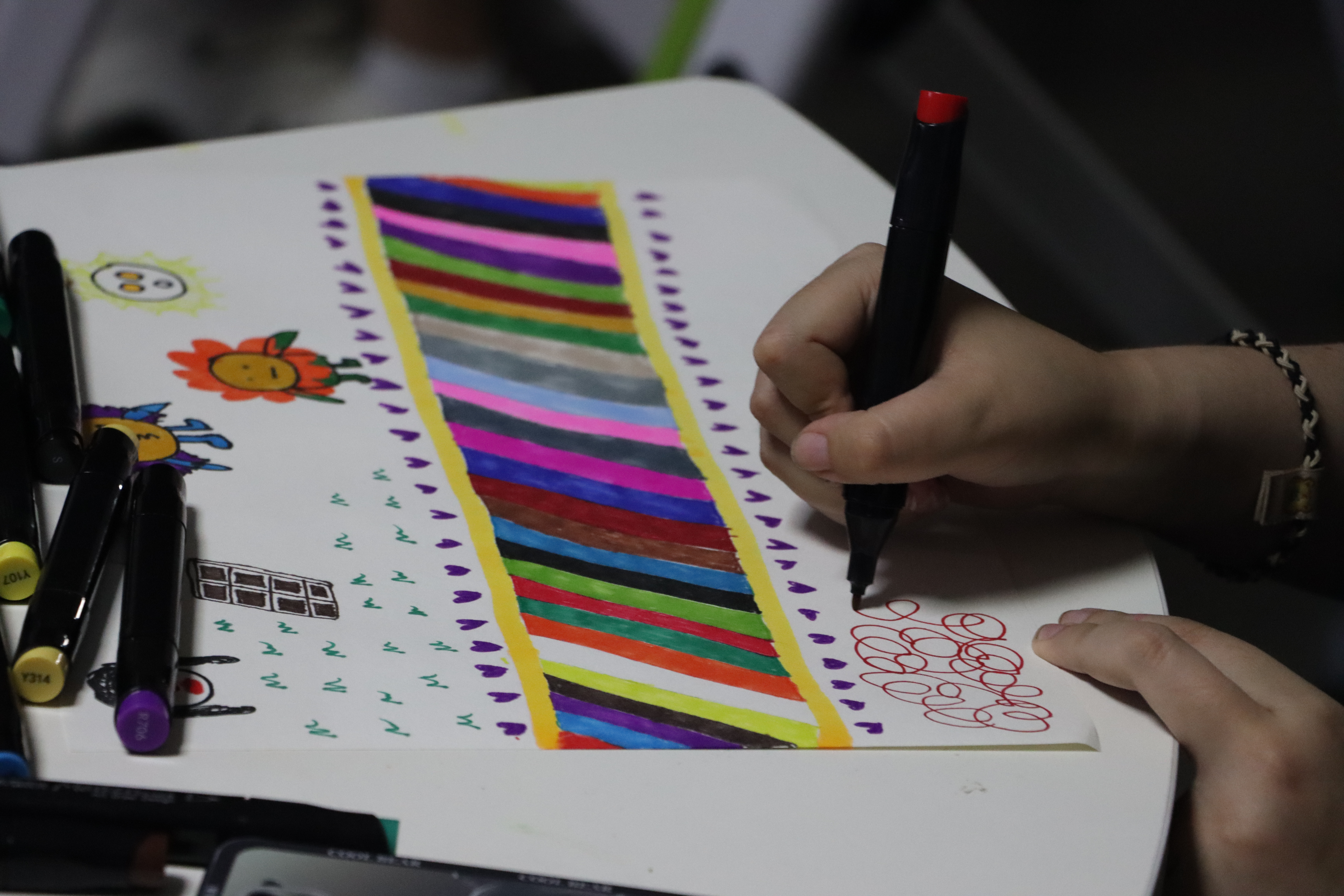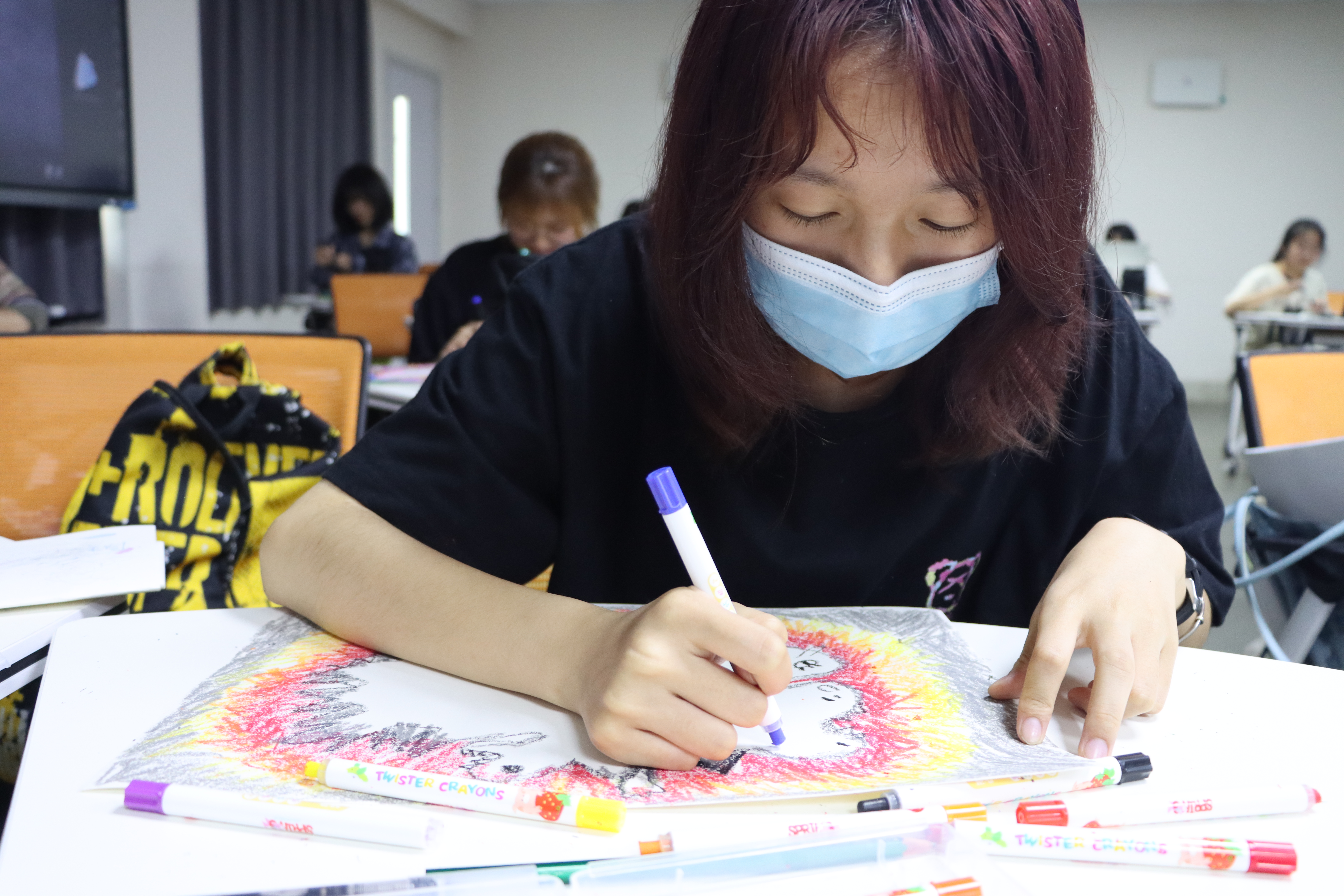 接着,郭海平老师让全体成员进行第二轮的创作。他希望大家放空思想,合理使用马克笔、油画棒等画图工具,不带任何情感和想法地画出自己内心想要的图案。