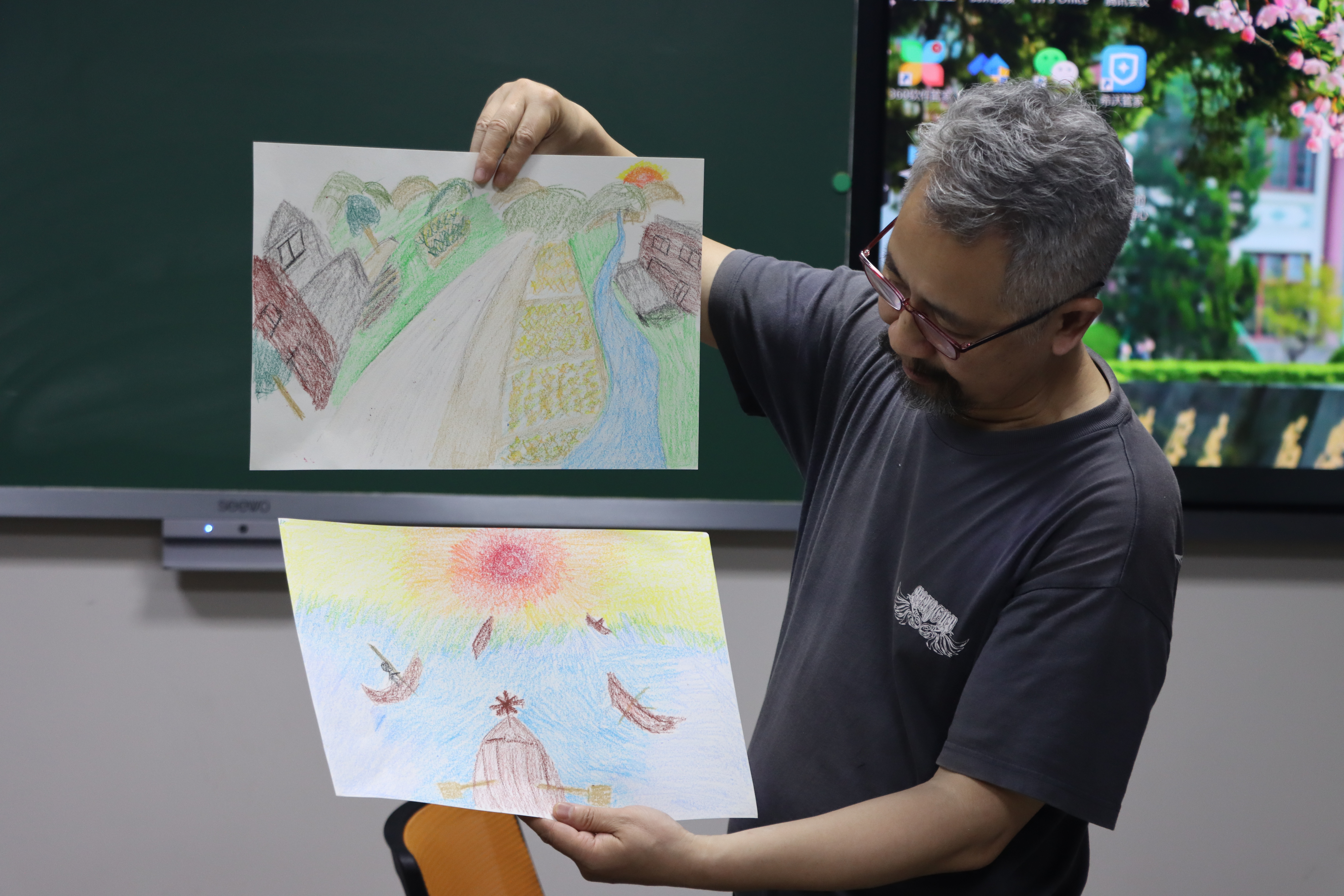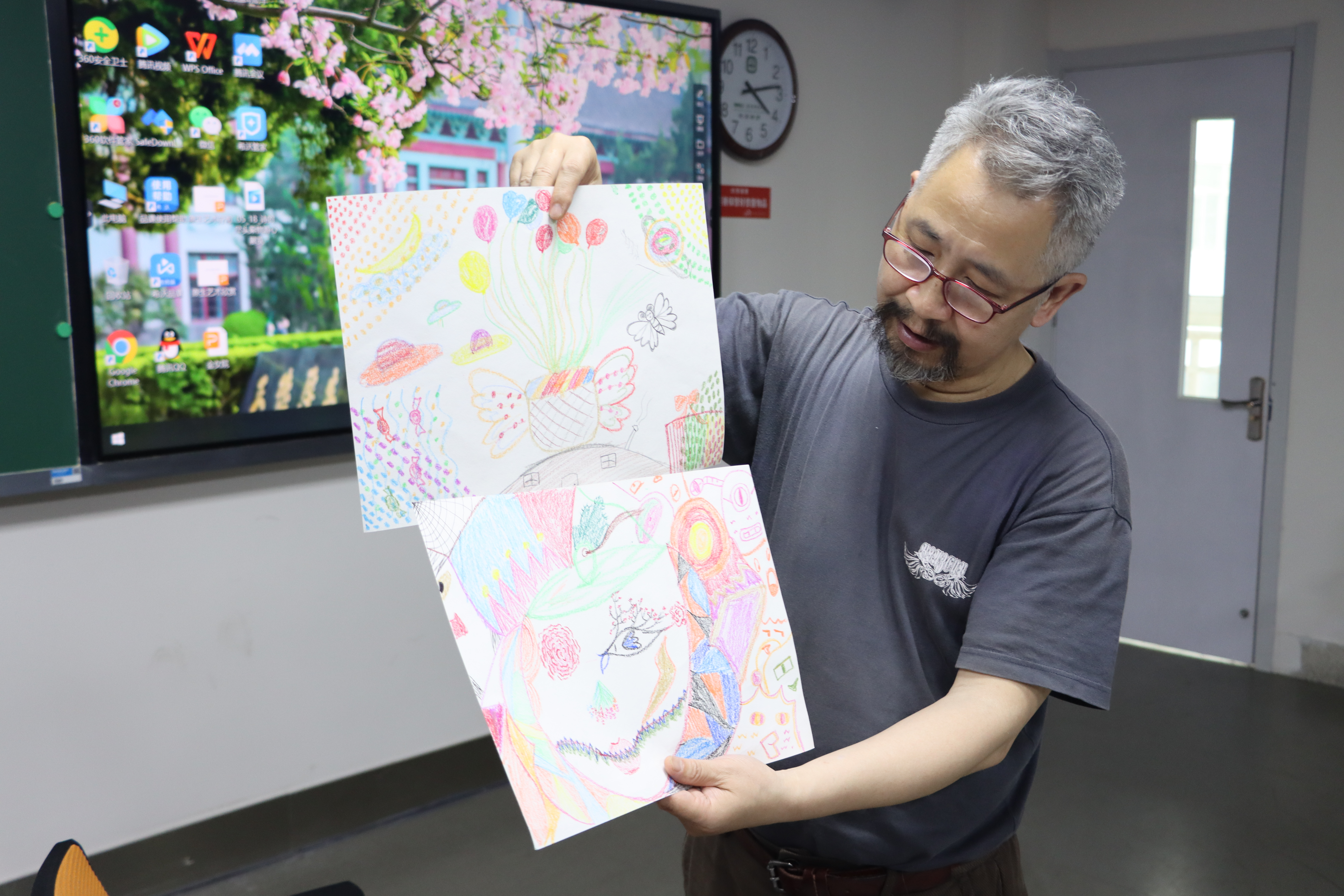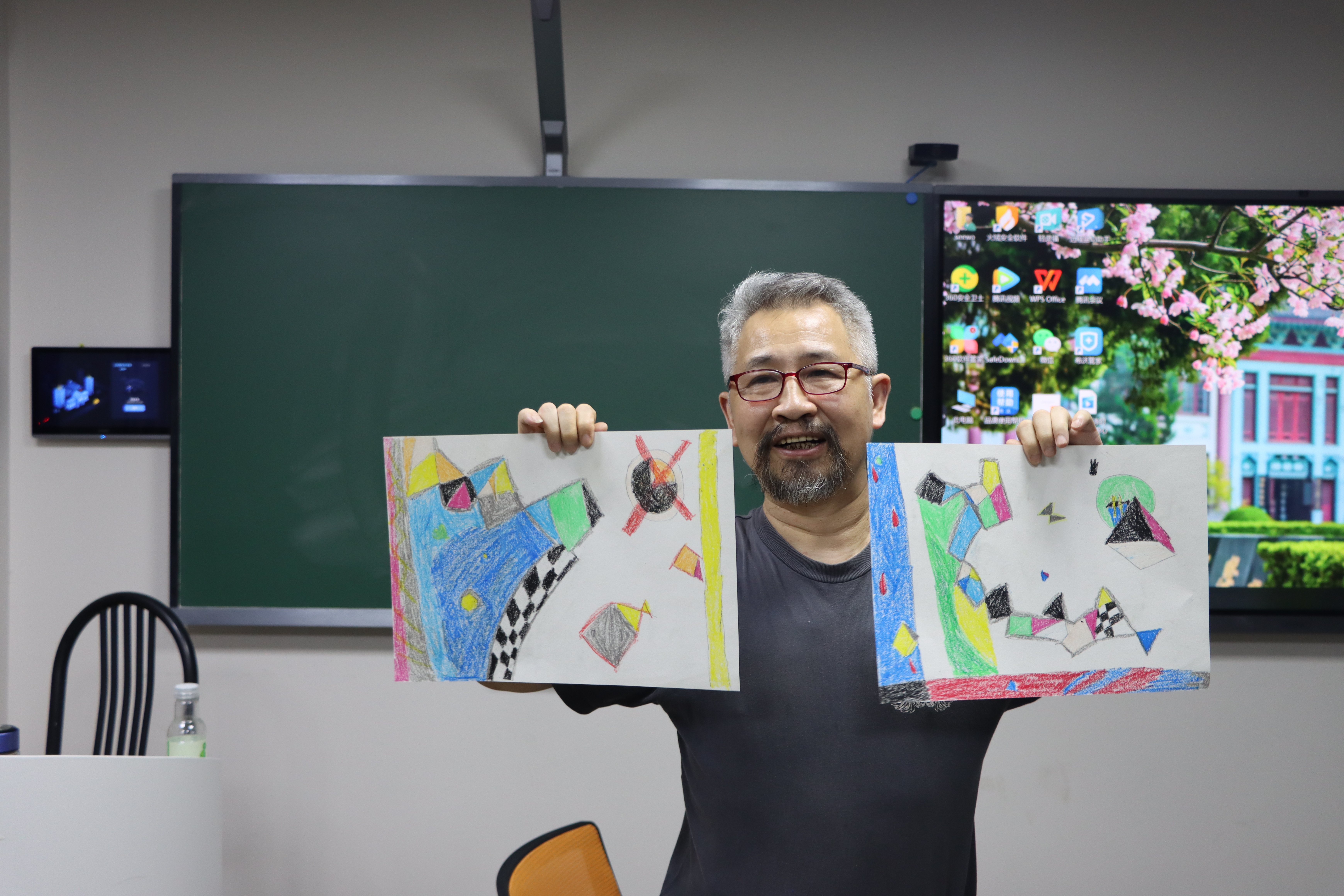 创作结束后,郭海平老师逐一点评学生的创作作品,分析创造者内心状态,并鼓励同学们进行二次创作。郭老师还针对同学们作品中存在的问题,强调在创作中要超脱经验、避免反复思考,追求更深入的潜意识交流。同学在与老师交流中,积极分享创作想法,认真聆听创作意见,深刻掌握了感悟艺术表达的方式,实现了审美素养的提升与拓展。至此,活动上午场结束。