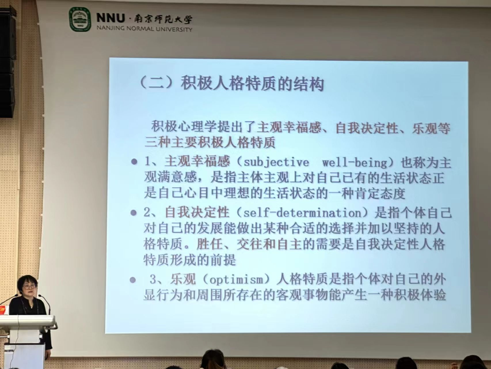 接着,桑教授提到了积极主义心理学启示。她告诉同学们“幸福,发展,快乐,满意”是人类成就的主要动机,心理学需要研究人的光明面,也需要研究人的优点与价值。借此桑志芹教授表明:经济发展与幸福感是平行的,但是在一定程度上也是不一样的;人们在相同环境下的不同感受其实并不是环境改变了,而是由于自身主观因素的改变,所以快乐也是需要自己选择的。桑教授强调道,在一定程度上,我们不能改变别人,就只能改变自己。人们可以选择感受,也就可以改变自己的感受,进而可以创造出持续的正面感受,最终也能够帮助别人创造这样的感受。这就是如何让自身、让他人快乐的关键。