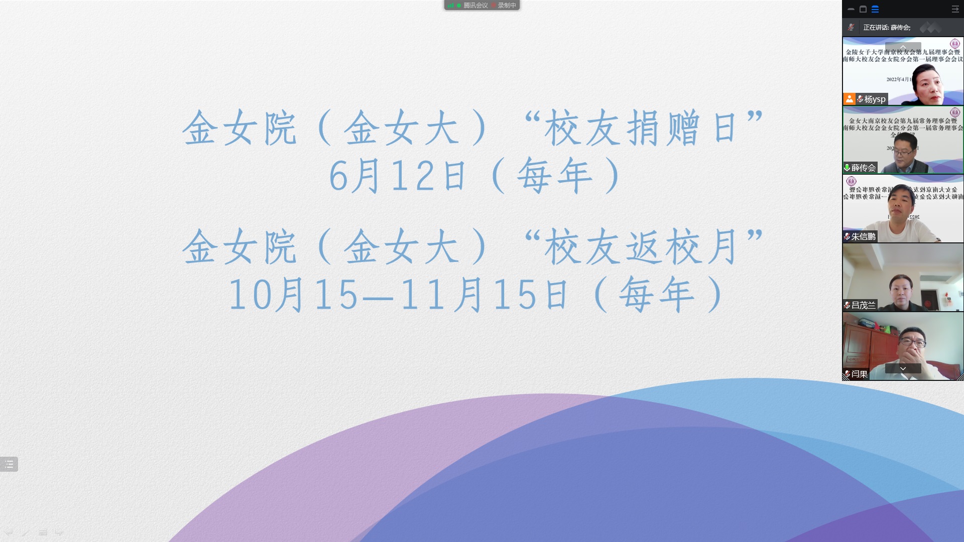 (金女大)“校友捐赠日”和“校友返校月”的必要性、可行性进行了深入讨论,最终一致表决通过关于设立“校友捐赠日”和“校友返校月”的决定。