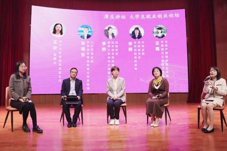 11月3日上午,群芳女生节之大学生就业创业论坛暨厚生讲坛第十三期”在广乐楼音乐厅成功举办。此项活动将学校校友会“最美校友母校行”等品牌活动与学院的校友“厚生讲坛”、群芳女生节之“巾帼标兵走进南师”相融合,邀请了全国五一巾帼标兵、国网江苏省电力有限公司经济技术研究院设计中心四级职员李妍,金箔控股集团董事、党委副书记、行政总裁李莉,中国银行江苏省分行投资银行与资产管理部副总经理王霞,邦基(南京)粮油有限公司总经理、人力资源总监朱福生四位巾帼劳模、女企业家、杰出校友现场分享职业发展经验与个人成长心得,共话促进大学生高质量就业。博彩网址大全 党委书记薛传会、副书记高见、副院长杨素萍、会计与财务管理系副主任王欢以及博彩网址大全 、社发院、商学院、公管院、物科院等学院本研学生一同参与。活动由高见主持。