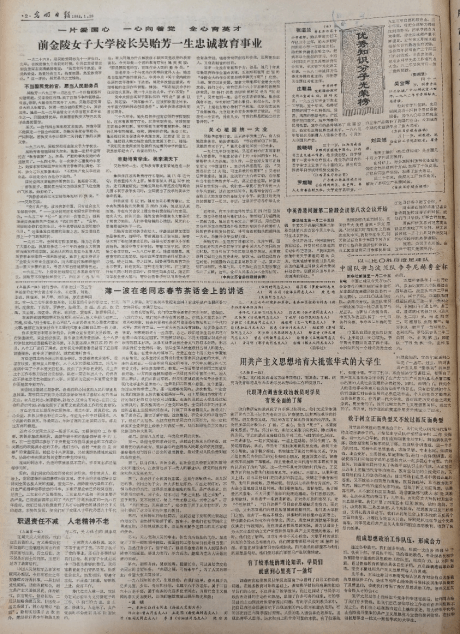 1984年1月26日,在吴贻芳先生91岁寿辰的那一天,《光明日报》发表题为《一片爱国心 一心向着党 全心育英才——前金陵女子大学校长吴贻芳一生忠诚教育事业》的文章。⑤同年2月19日,《人民日报》发表题为《对祖国一往情深——记民进中央副主席吴贻芳》的报道。文章中写到“几十年来,她把自己的命运同祖国的命运紧紧地联系在一起,为祖国的强盛殚精竭虑,赢得了党内外同志的尊敬与爱戴。” ⑥