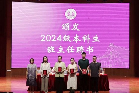 院党委书记薛传会、院长边霞为赵丽芬、邓萍、彭辽、吴佳美四位老师颁发2024级本科生班主任聘书。学院高度重视班主任作用,不断增强学院管理能力、完善综合教育体系。今后的日子里,本科生班主任们将以最饱满的热情和最严谨的教学态度陪伴本科新生共同成长。