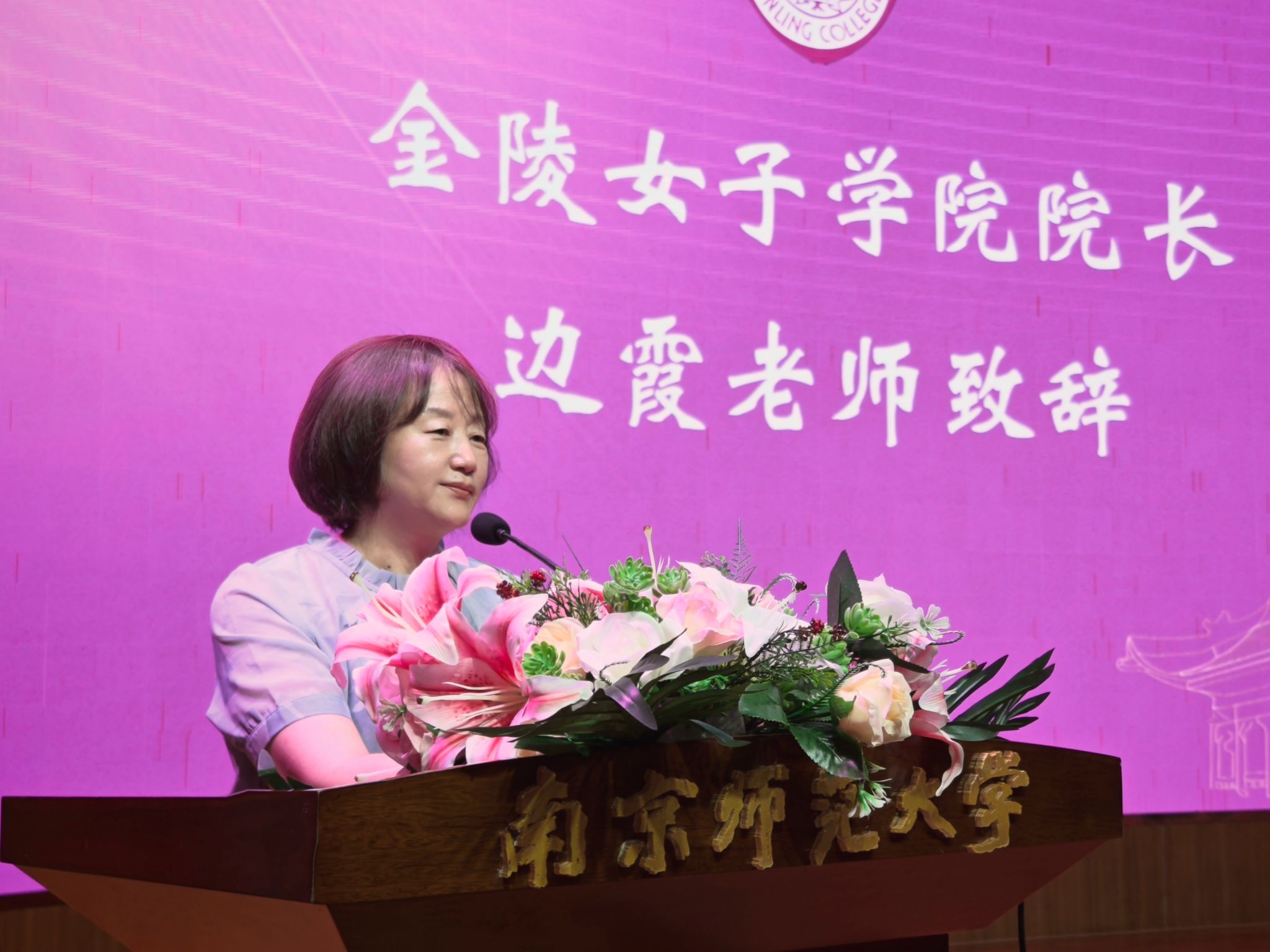 她介绍了新时代学院办学特色:秉持全人教育理念,同时坚持国际化道路,以培养高素质女性人才为办学目的。学院开创性的设立了“贻芳书院”,开展了特色课程。她鼓励新生积极参与体验,促进专业与素养共提升。她希望同学们能够在金女大的历史传承之中汲取营养,以厚生为己任,拒绝躺平,在这段新的人生历程中坚持努力奋斗,放飞梦想,踏实耕耘,以追求远大理想。