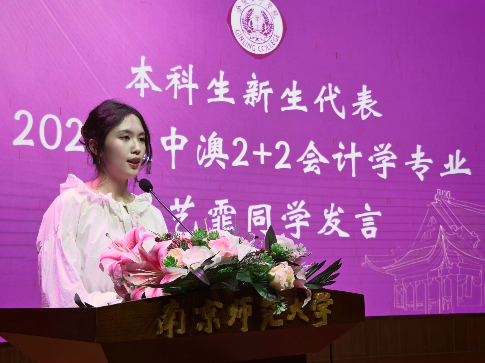 2024级中澳2+2会计学专业王艺霏代表本科生发言。她讲述了自己的求学初心、南师情缘和个人理想。她表示,同学们将践行 “正德厚生,笃学敏行”的校训,以梦为马,不负韶华,绽放青春之光,努力成为南师大的优秀学生。