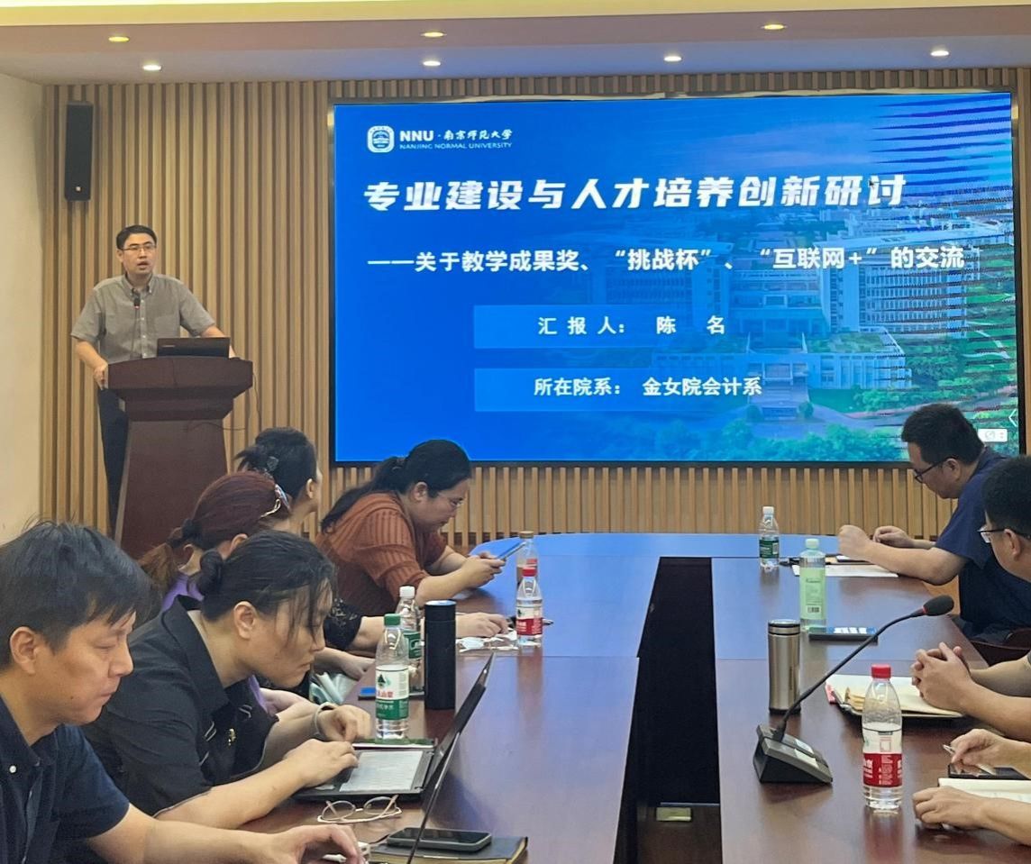 会议首先由会计系陈名老师发言,主题为“教学成果奖申报及学生竞赛指导”。陈老师梳理了近年来国家级、省级教学成果奖获奖选题,认为申报过程中需要注重前期专业信息积累,关注政策导向,凸显平台特色。另一方面,陈老师着重以“挑战杯”学生竞赛为例,总结出竞赛热点议题及对应赛道评比要点,并强调学生竞赛指导需要依托导师优势,对应成果需要落地。