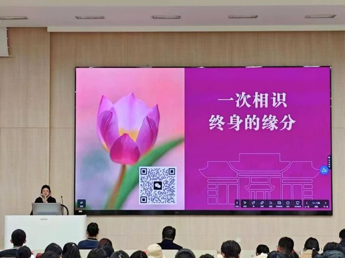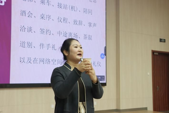 她与同学们共同探讨了礼仪与当代大学生成长、成才、成功之间的关系。通过引用《红楼梦·第五回》中的“世事洞明皆学问,人情练达即文章”,她指出,在日常学习和生活中,尤其是在AI虚拟时代下复杂的人际关系网中,同学们不仅要培养学识,还要注重人际交往和情感体验。