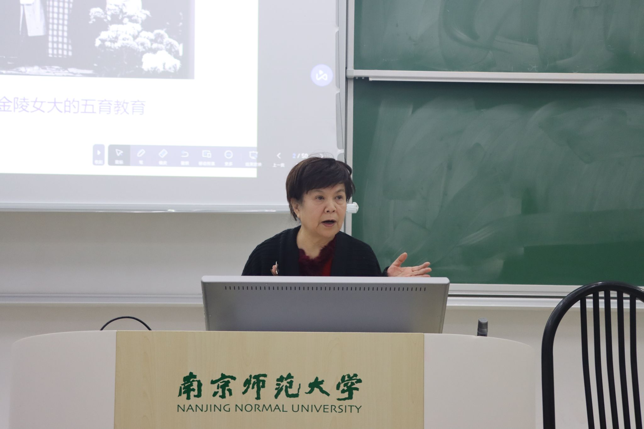 最后,金教授以金士杰、白龙寻“根”的故事为结,展现了金女大精神文化传统的历史传承和深远影响。她从自己做口述史,走访、记录并讲述“金女人”生动故事的经历中,感慨金女大的“全人教育”和厚生精神。她希望同学们能够理解金女大教育思想的源流,感悟校友精神,从而厚植家国情怀,在今后的学习和生活中孜孜不倦、笃行不怠。
