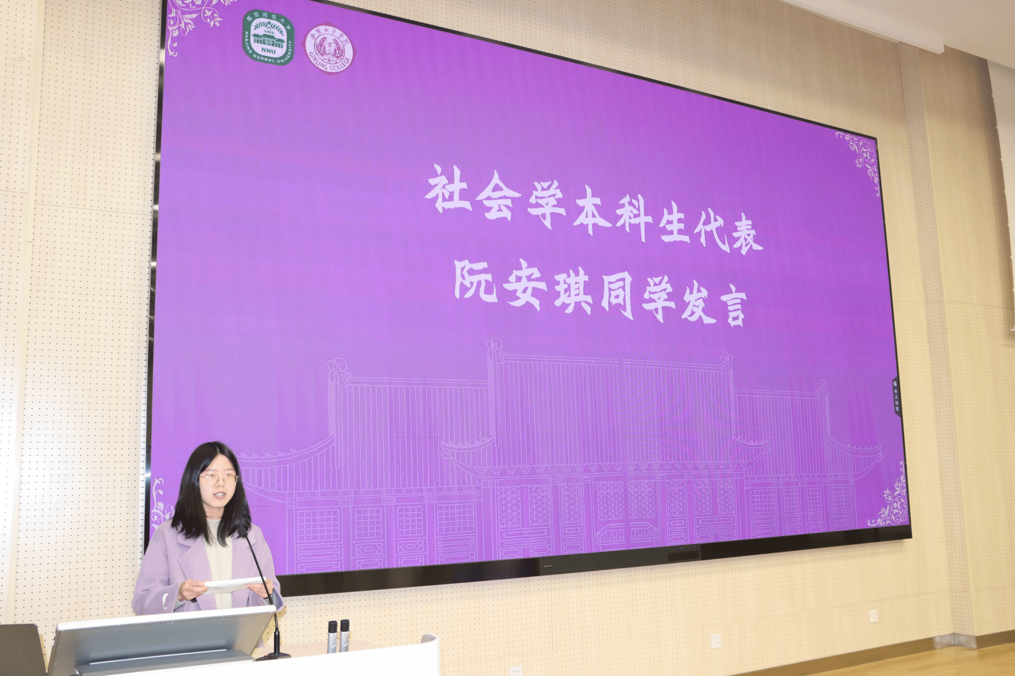 2023级社会学本科生代表阮安琪在发言中分享了自己在社会学专业学习、调研和支教等成长经历,并表示将珍惜新学院提供的优质资源,努力提升学术能力与社会责任感,为学科发展贡献力量。
