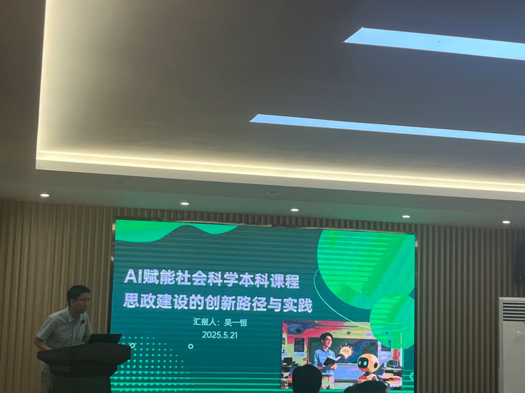会议首先由社会学与社会保障系吴一恒老师发言,吴老师围绕着主题“AI赋能社会科学本科课程思政建设”中的几个概念进行了解读。吴老师从研究内容和研究方法两方面介绍了社会科学的基本特征,又从根本目标、内容融合、教学方法、教师要求四个方面解读了本科课程思政的内在要求。随后介绍了AI的技术特点:效率高、精准性强、决策支持、跨领域赋能、普惠性强。最后对于AI赋能社会科学本科课程思政建设的创新路径与实践方面,吴老师分享了三点。第一,技术融合-构建智能化思政教育生态。通过精准化学情分析和虚拟仿真教学场景帮助提高思政教育。第二,内容重构-AI驱动的思政资源生成。通过动态案例库建设和跨文化比较教学构建课堂讨论案例。第三,方法革新:人机协同教学模式。通过基于知识图谱的辩论AI,引导学生多角度思辨。