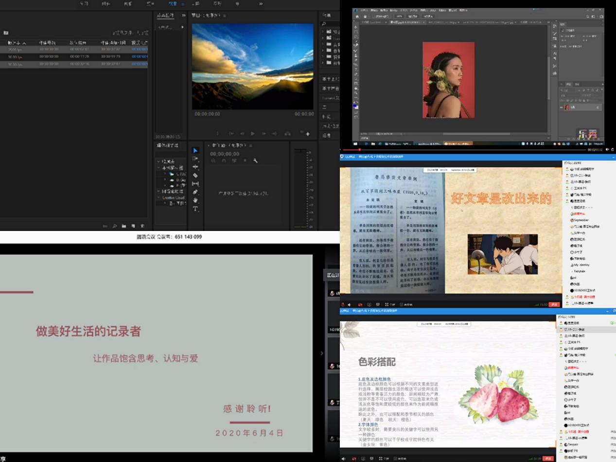 教工党员赵妍、李凡程、院学生会新宣部干事王冰冰、院新媒体中心干事马榕、新闻部部长李顺分别为大家分享视频剪辑、照片拍摄、图片处理以及新闻稿写作、排版等内容。院学生会办公室干事王一涵主持本次微讲座。