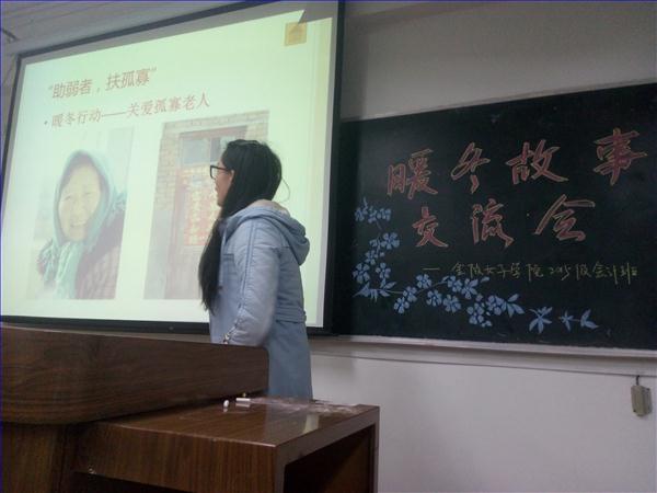 交流会在同学们的掌声中拉开序幕。“助弱者,扶孤寡”,身为大学生,当用此心去温暖社会、回馈社会,实现青春的价值,业蕾同学分享了回到家乡以后探访邻居老奶奶的感触,娓娓道来的是孤寡老人需要陪伴的现状,唤醒的是同学们关爱老人的善良之心。