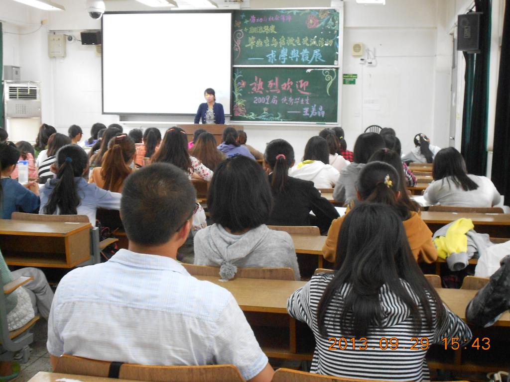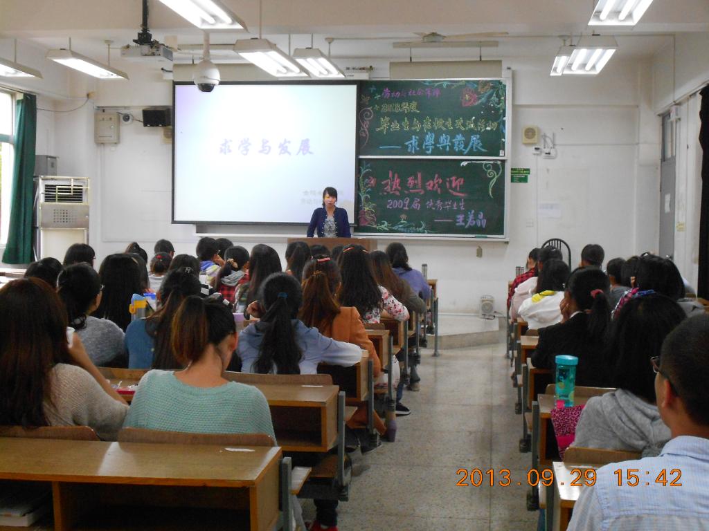 2013年5月8日下午,博彩网址大全 劳动与社会保障专业的11级、12级和13级的全体同学,于学正楼105热烈开展了以“求学与发展”为主题的毕业生与在校生交流活动。2009届劳动与社会保障专业优秀毕业生,现于中国人民大学攻读博士学位的王若晶学姐在会上介绍了有关学习和考研的经验。系主任彭薇老师主持了此次活动。