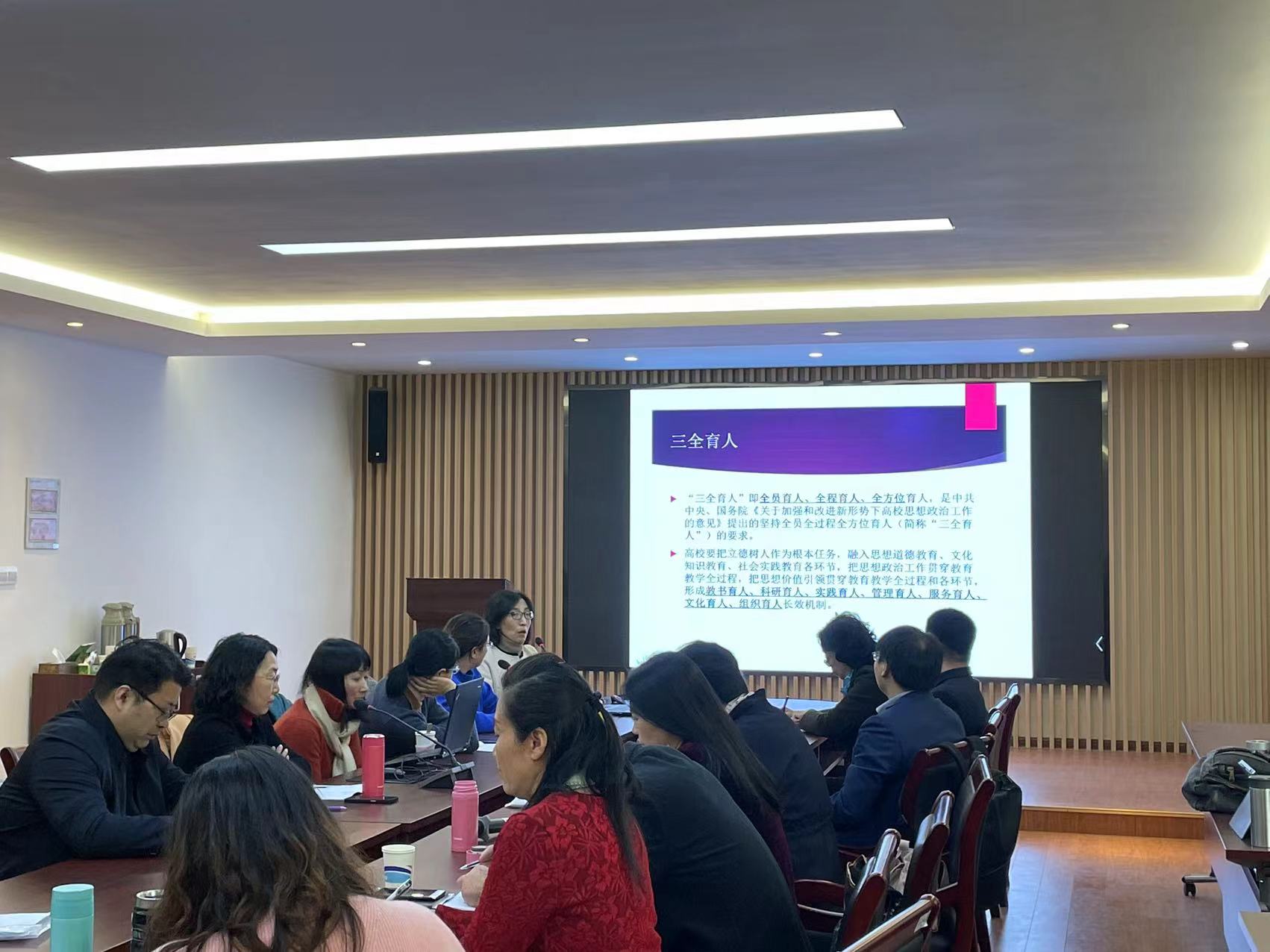 沙龙起初由朱运致主任简介了三全育人的思想内涵——全员、全程、全方位教育人、培养全面发展的人。朱老师还从课程角度探讨了合作式集体教育:《世界戏剧面面观》课程是校重点博雅课,系里组织了十人教学团队,各教授各有所长,所以大家设计了完整、有机一体的教学计划。此外,朱教授还介绍了《专业导论与探讨》、《中国文化概要》的整体写作在培养学生的过程中强化全方位育人的方方面面——培养学生对中国文明和文化的认同感,提高学生讲好中国故事的能力。对学生比赛的指导,采取专人专项负责制、轮岗带队参赛,分散带队负担的策略。朱教授还介绍了“协同式学生发展体系建设”的情况:采用年级主任制,一到四年级分别由曹晓旸、叶红、沈继荣、马黎燕等教授负责,中美联合办学班全部由秦海花教授负责。系里特别重视专业与学工、专业与教务、跨学院、学院与各处、学院与国内外的联系。