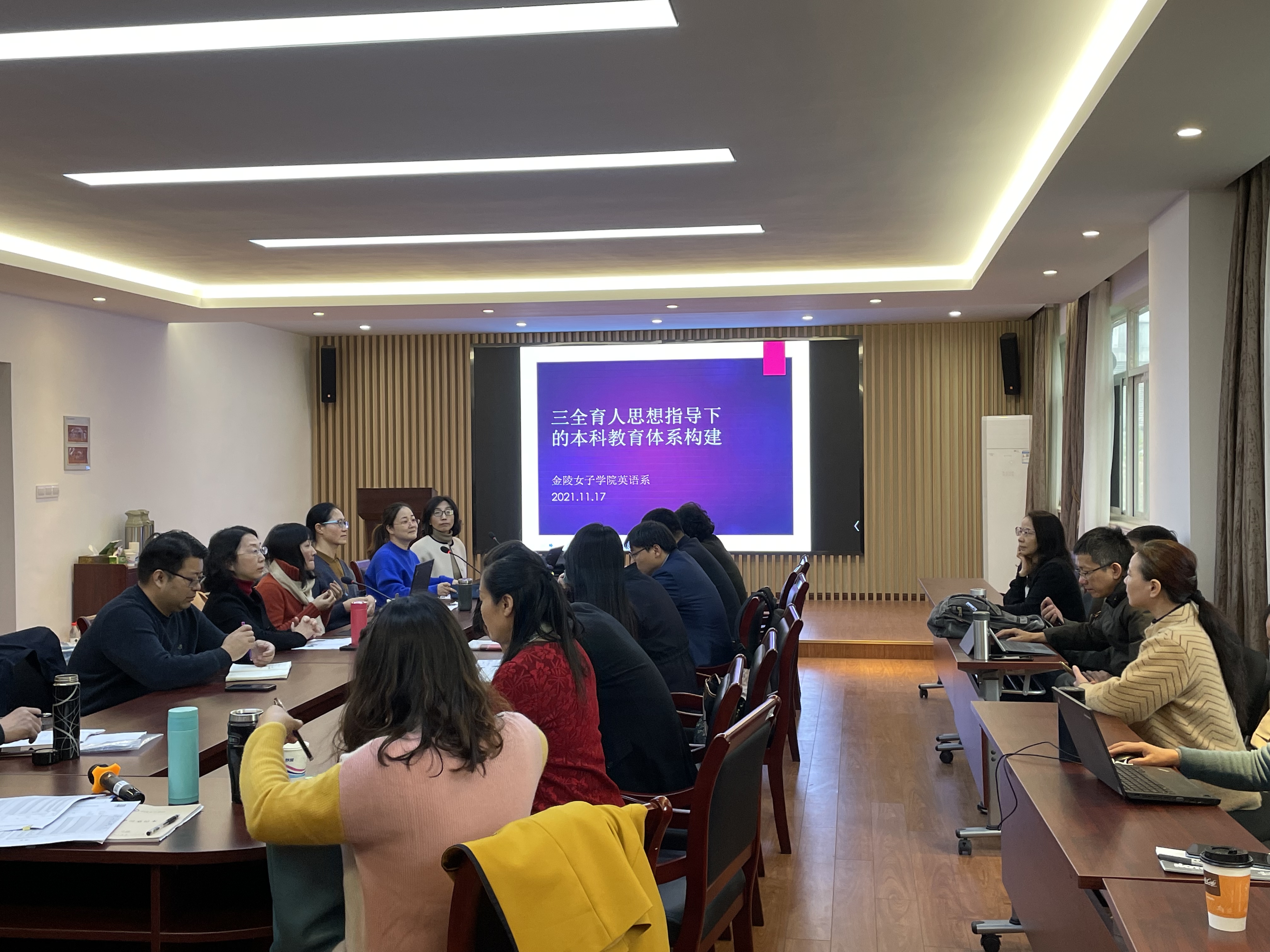 全体教师在随园403会议室召开了题为“三全育人思想指导下的本科教育体系建构”的教学沙龙,沙龙由张戌凡教授主持,英语系7位老师从不同角度做了发言。出席沙龙的还有教务处叶飞副处长、学院领导赵媛院长、薛传会书记、封思贤副院长、杨素萍副院长、高见副书记、教务处督导钱焕琦教授。