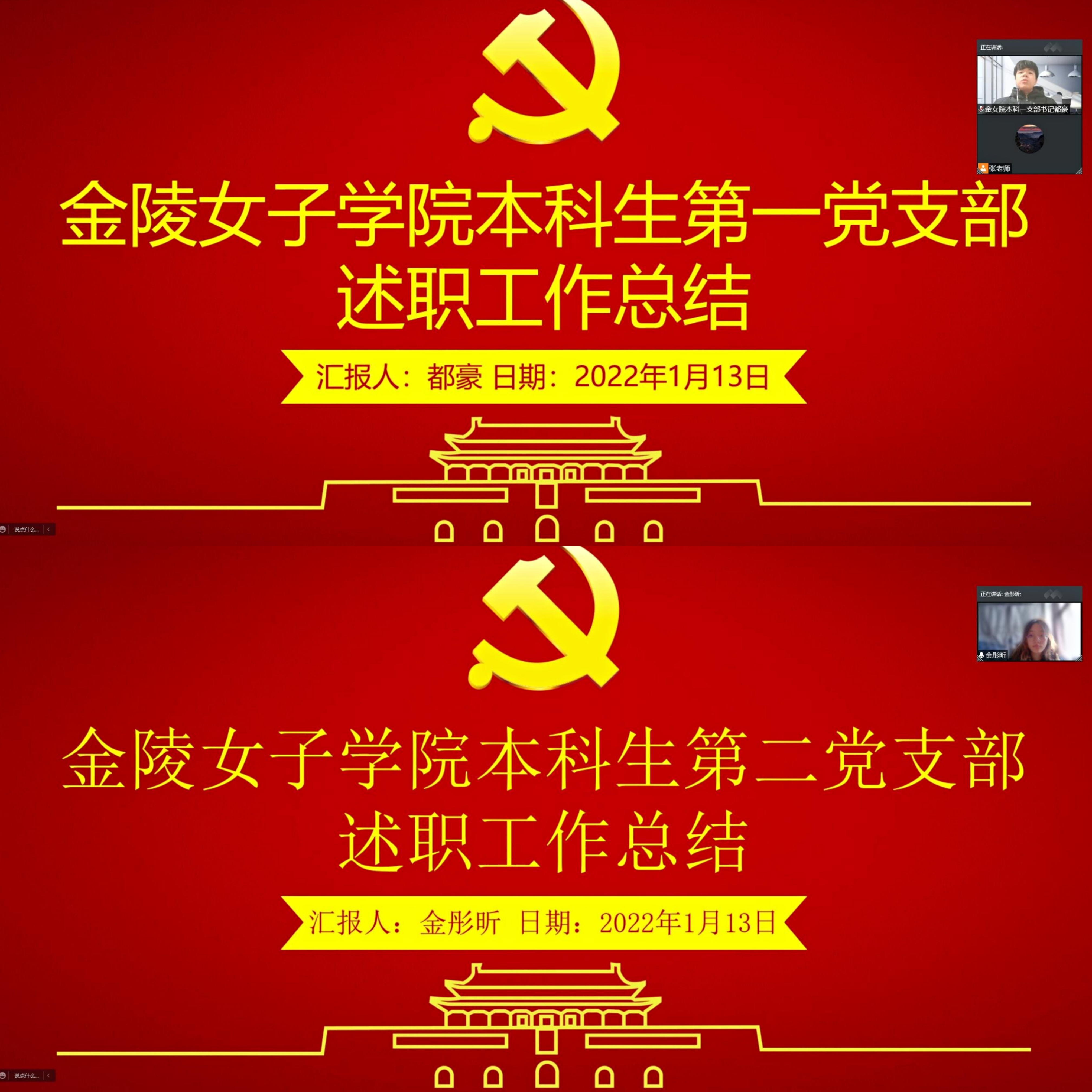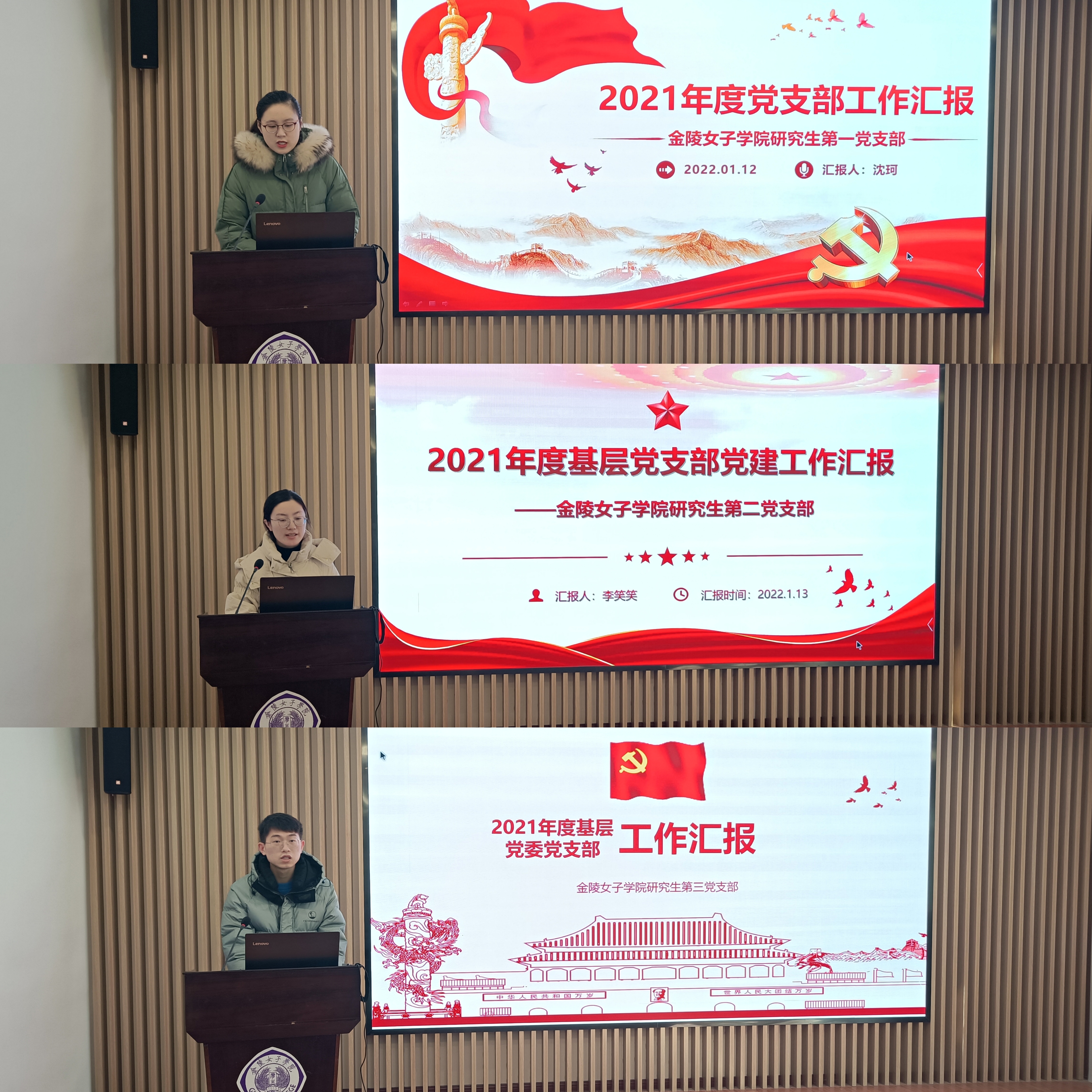 会上,教工第一党支部书记杨素萍、教工第二党支部书记王水娟、教工第三党支部书记张戌凡、退休教工党支部书记彭薇、本科生第一党支部书记都豪、本科生第二党支部书记金彤昕 、研究生第一党支部书记沈珂、研究生第二党支部书记李笑笑以及研究生第三党支部书记汪晗阳围绕党支部党员队伍建设、思想政治教育、自身组织建设、组织生活制度、支部作用发挥、支部工作创新、存在的问题及努力方向等方面的情况依次进行了述职。