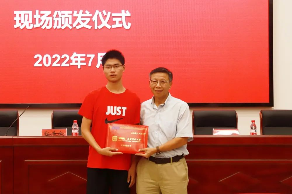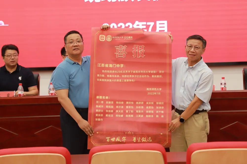 南京师范大学党委常委、副校长张序余向江苏省海门中学党委书记、校长石鑫赠送喜报并亲自为录取到南师大的新生颁发录取通知书。