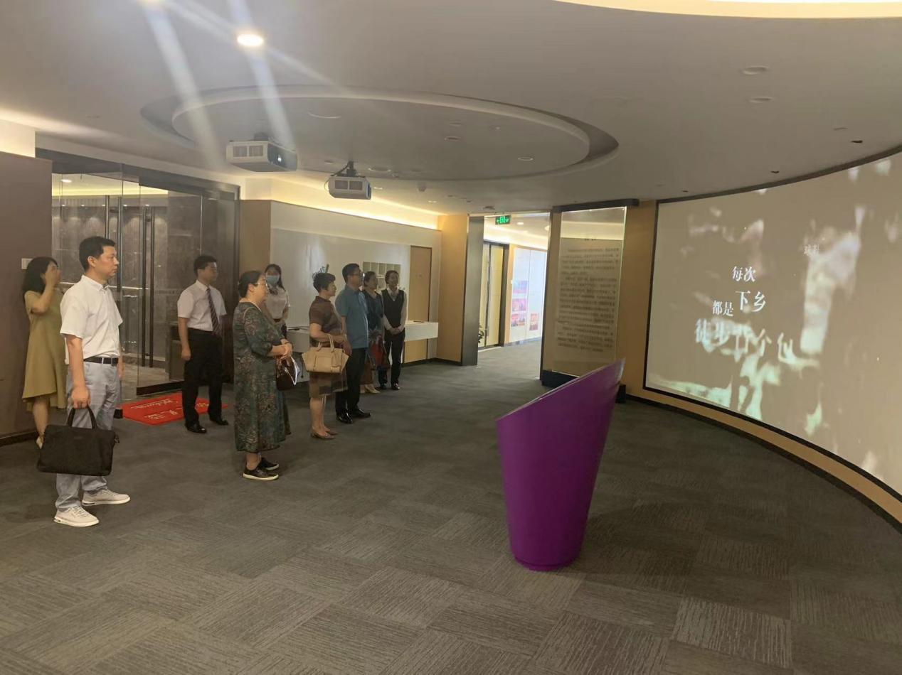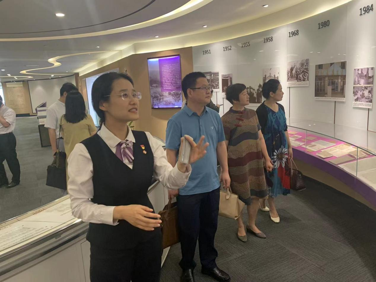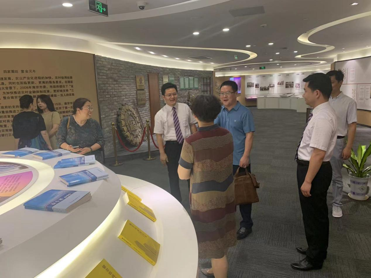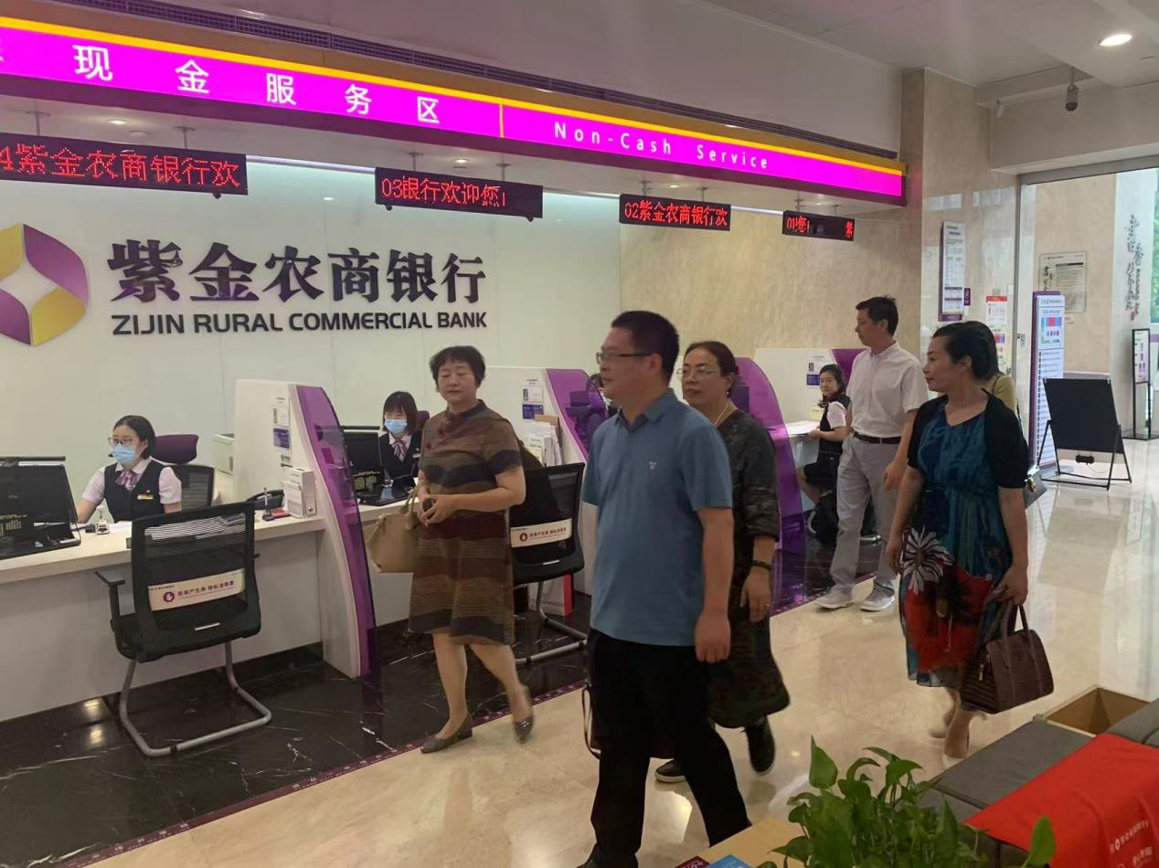 在紫金农商银行总行营业部李晓宇总经理的陪同下,博彩网址大全 党委书记薛传会、院长边霞一行首先参观了位于南京河西金融城的紫金农商银行总行营业室、行史馆。