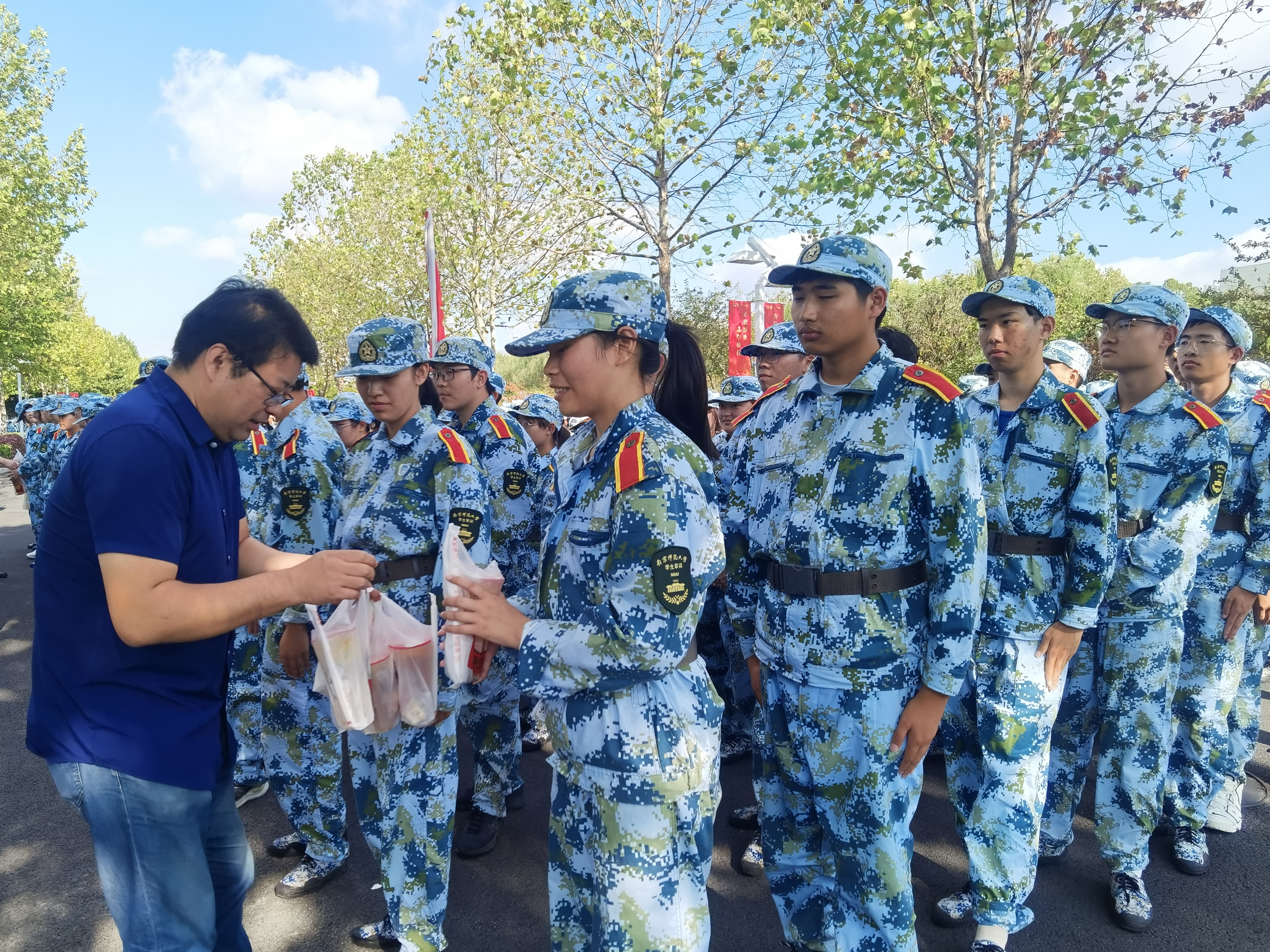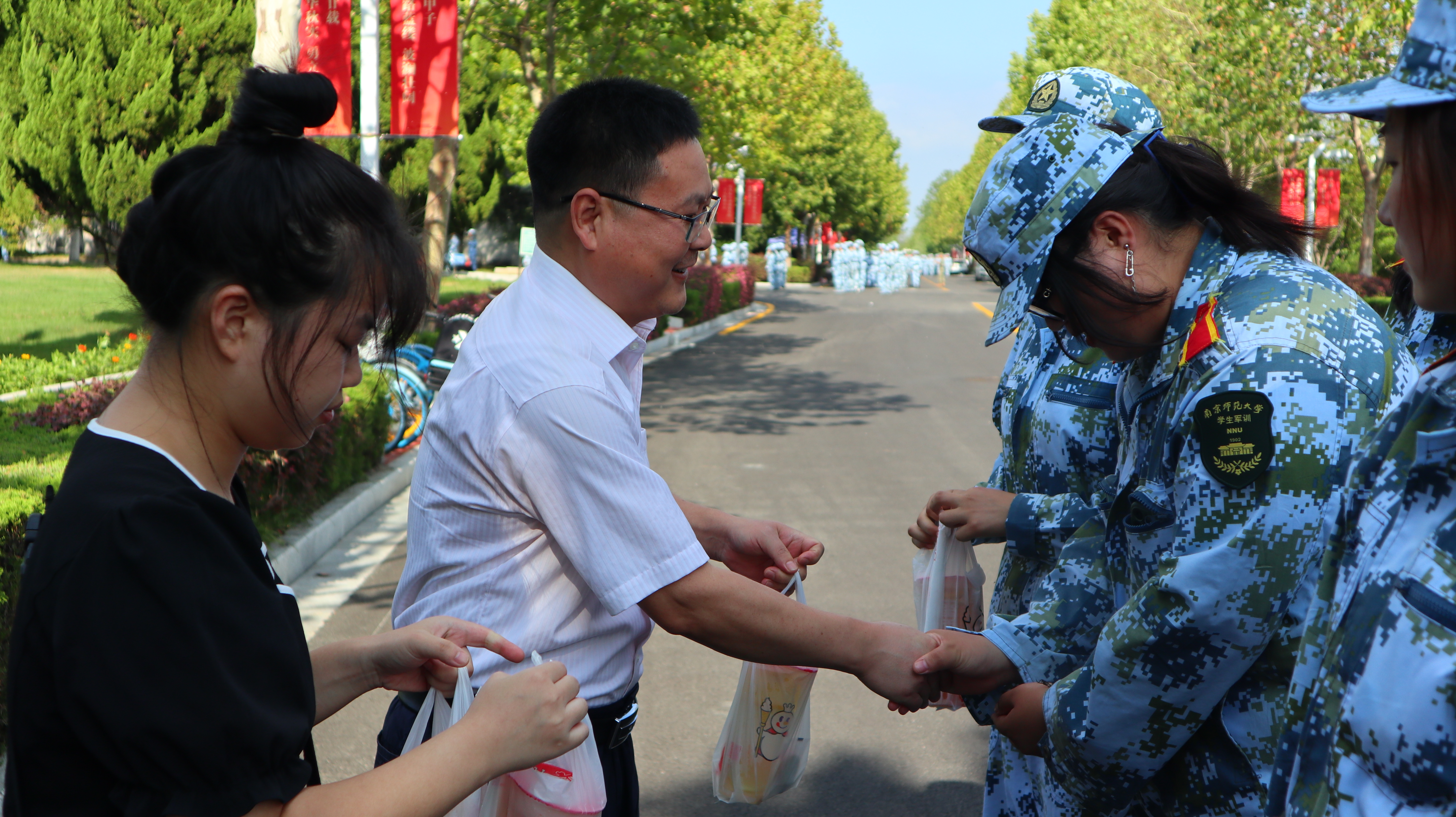 讲话完毕后,薛书记与高书记一同为大家分发慰问品,再次向教官们的付出表达感谢,希望同学们能够在接下来的军训中继续努力,在汇报演出中大放异彩。