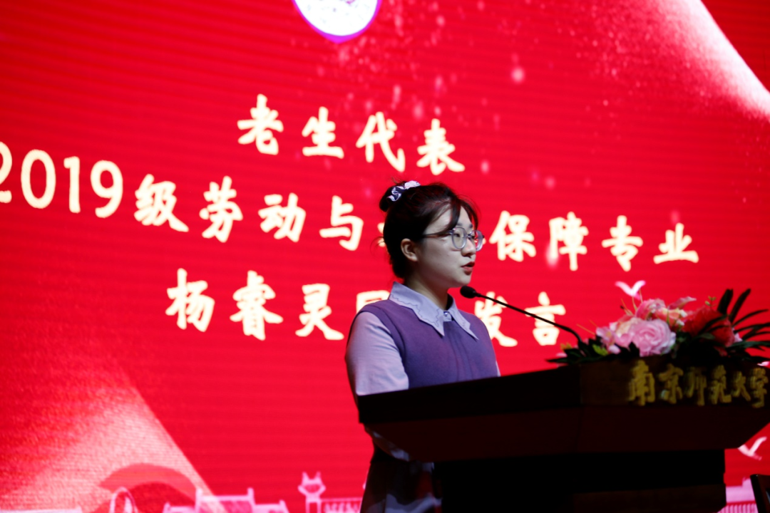 2019级劳动与社会保障专业杨睿灵同学作为老生代表向全体本研新生送上了鼓励和祝福。她从自身的成长经历切入,分享了自己从初入大学的迷茫到后期逐渐适应、提升自我的蜕变历程,并提出了“苦练脑力、稳练脚力、勤练眼力”的宝贵建议,勉励新生坚定信念、砥砺前行。