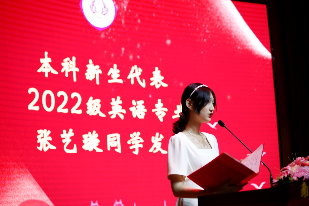 接着,2022级英语专业的张艺璇作为本科生新生代表发言。她讲述了高中阶段对南京师范大学的向往,抒发了步入大学生活后的欣喜,介绍了自己对于“笃学”校训的理解。她以一则谜语揭示了金女人的精神特质和价值追求,号召新生们勤勉奋进,继往开来,开创金女更加光明的未来道路。