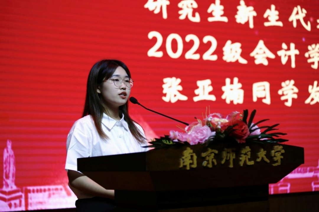 随后,2022级研究生新生代表会计学硕张亚楠同学上台发言。她表达了能够在南师百廿风华之年接力前辈学长,续写南师大和博彩网址大全
