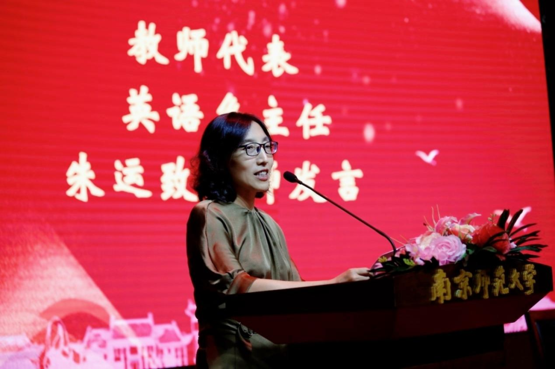 教师代表英语系主任朱运致从“胸怀大志”与“为人大度”两个维度进行发言。她指出,大学生活要求学生积极发展自身能力,开拓未知领域,主动跳出舒适圈的束缚,突破思维的桎梏,解锁更多潜能;要以服务社会为己任,努力实现人生价值,力争在更广阔的平台遇见全新的自己。