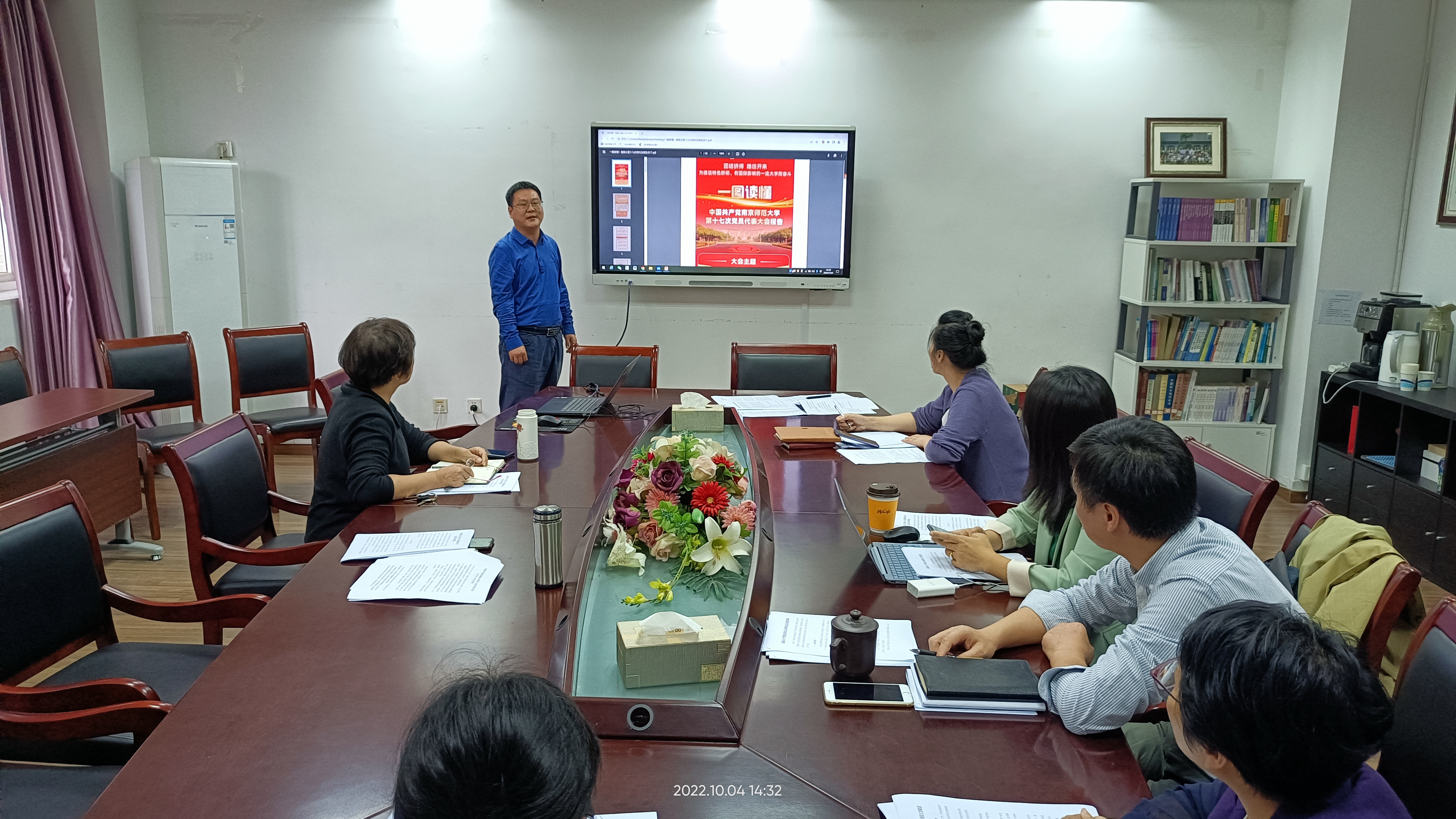 薛传会首先介绍了学校第十七次党员代表大会的基本情况和学院4位党代表的履职情况,并传达了学校第十七次党代会的精神。薛传会从“总结”“方向”“目标”“格局”等方面领学了王成斌书记代表中共南京师范大学第十六届委员会向大会所作的工作报告。工作报告系统回顾了学校过去五年来的发展成就和经验;明确了学校未来勇毅前行的方向;提出了建设“特色鲜明、有国际影响的一流大学”的中长期办学“目标;部署了构建“师范特色、文科特长、理科特强、工科特新”的新办学“格局。工作报告是指导今后一个阶段学校发展的纲领性文件,必将极大激励广大师生建功新时代、奋进新征程。