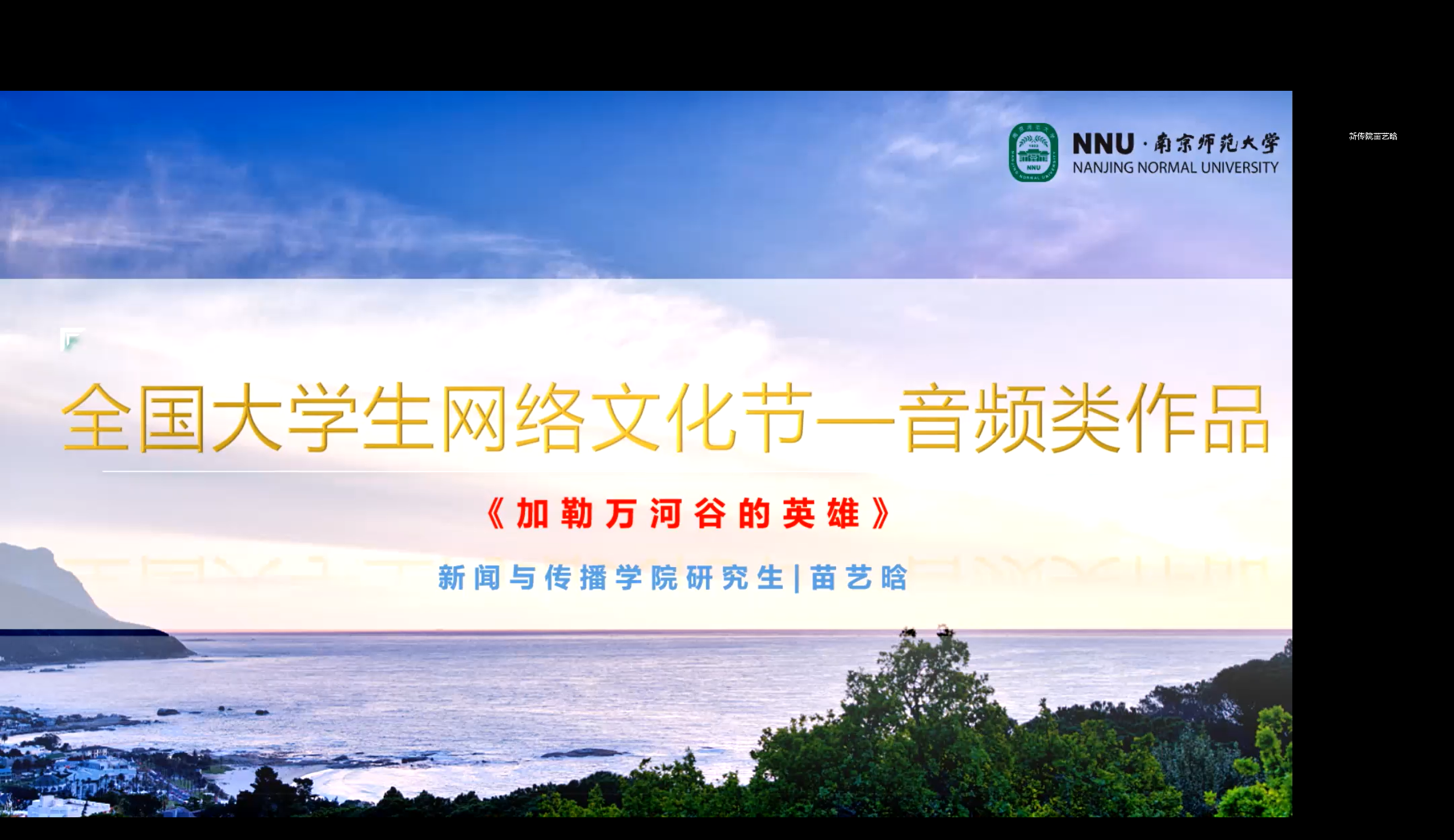 第五届全国大学生网络文化节音频作品一等奖获得者新传院2021级研究生苗艺晗则首先展示了她的获奖音频作品,动人的文字与真挚的语调使与会成员沉醉其中。接着,她从选题启示、创作要素和参赛须知三个方面进行了分享。选题要具有家国情怀,紧扣时事热点,兼顾大情怀与小细节,全新演绎经典作品,使题材得到广泛传播,引起听众共鸣。文稿、垫乐、演绎、搭配、录制以及后期无一不是成就一个好作品的必备要素。她的专业讲解和详实精彩的分享让大家受益匪浅。