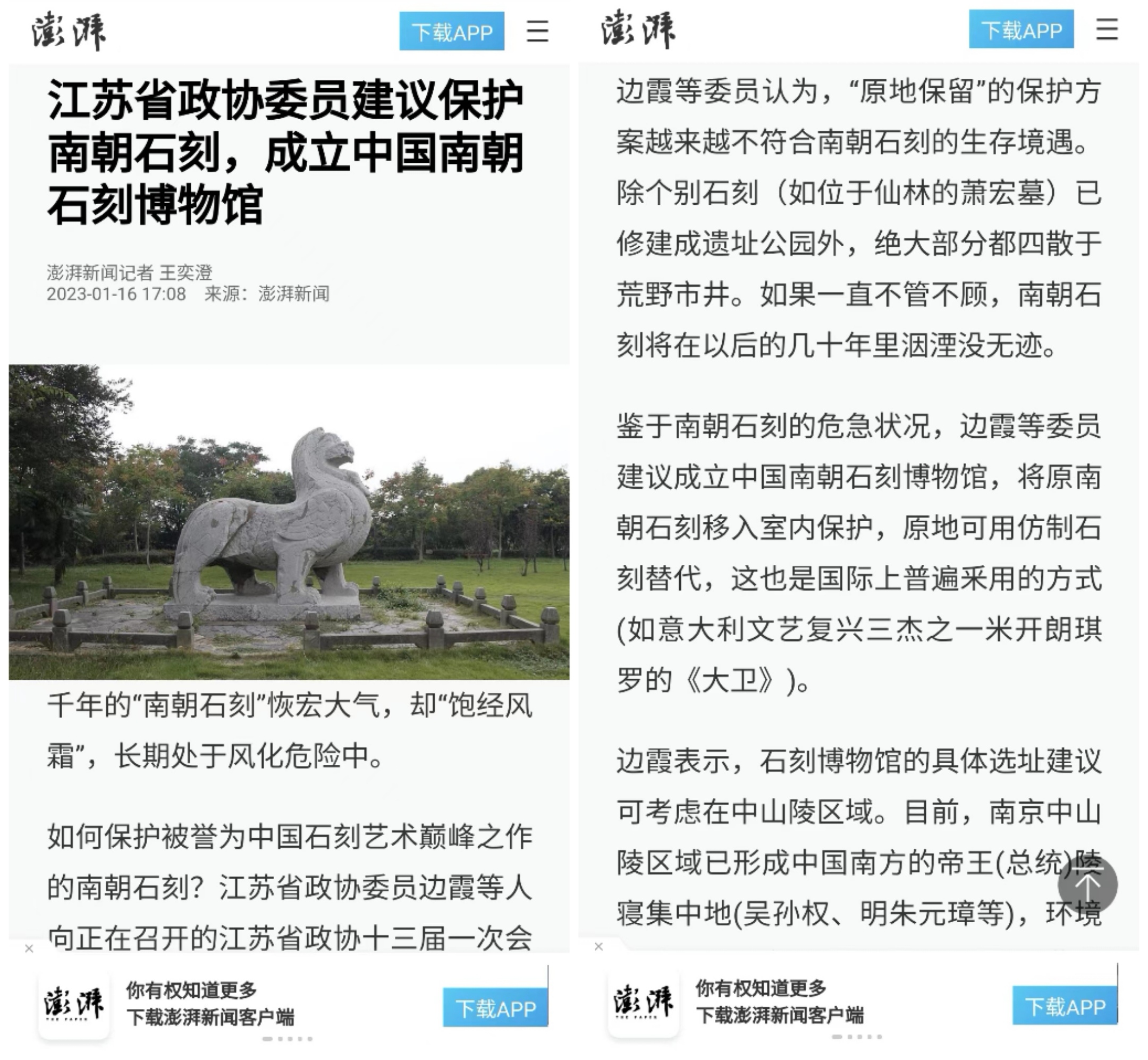 对于中华传统文化保护及传播议题,边霞院长等委员提交了“关于南朝石刻迁移保护”的提案,并做了题为《突破性拯救南朝石刻 守护传承中华文明根脉——关于南朝石刻迁移保护的建议》的联组会议发言。南京及周边有33处六朝石刻遗存,包含大型陵寝石刻80余尊,这些石刻是中国石刻艺术的巅峰之作,在世界雕塑艺术史上亦具有举足轻重的地位。但近年来,由于冻融、酸雨等的侵蚀,石刻不断加速风化的命运令人揪心,原有陵寝的整体风貌也已荡然无存。边霞院长等委员认为,“分散原地保留”的保护方案已不符合石刻的生存境遇,建议成立中国南朝石刻博物馆,将石刻转为室内保护,原地使用仿制石刻替代,这也是国际上普遍釆用的方式。边霞院长表示,石刻博物馆的具体选址建议可考虑在中山陵区域,建设全地下场馆。建成后既可以成为中山陵风景名胜区的一部分,又可以形成新的文化研究中心。当然,基于南京栖霞区南朝石刻群的地缘优势,也可以考虑在栖霞山附近选址,或在仙林大学城依托部分高校的历史文博资源(如南京师范大学)来建造博物馆。这将是一个重量级的艺术博物馆,成为一个吸引世界目光、向世界展示和传播中华艺术的新的文化标识。