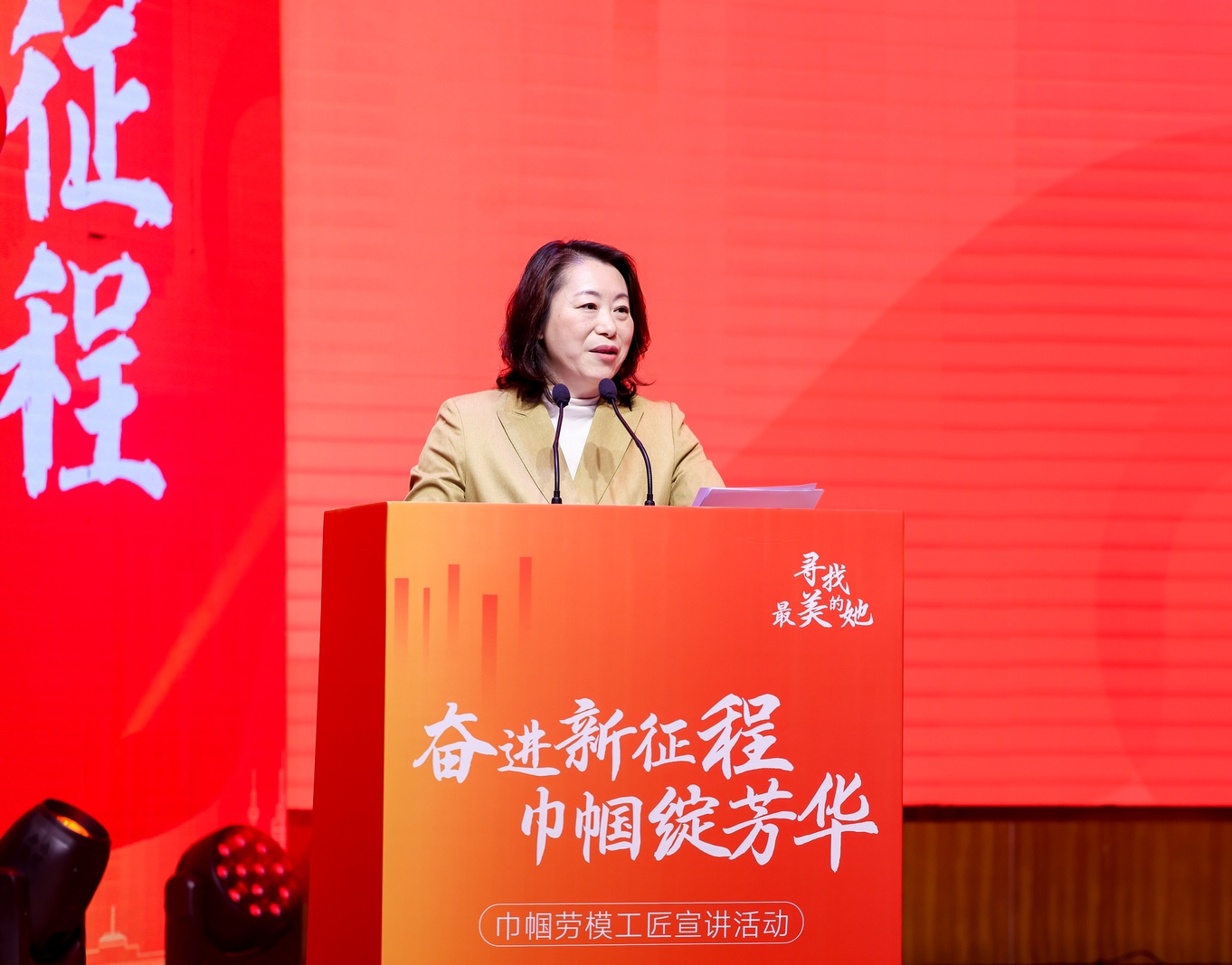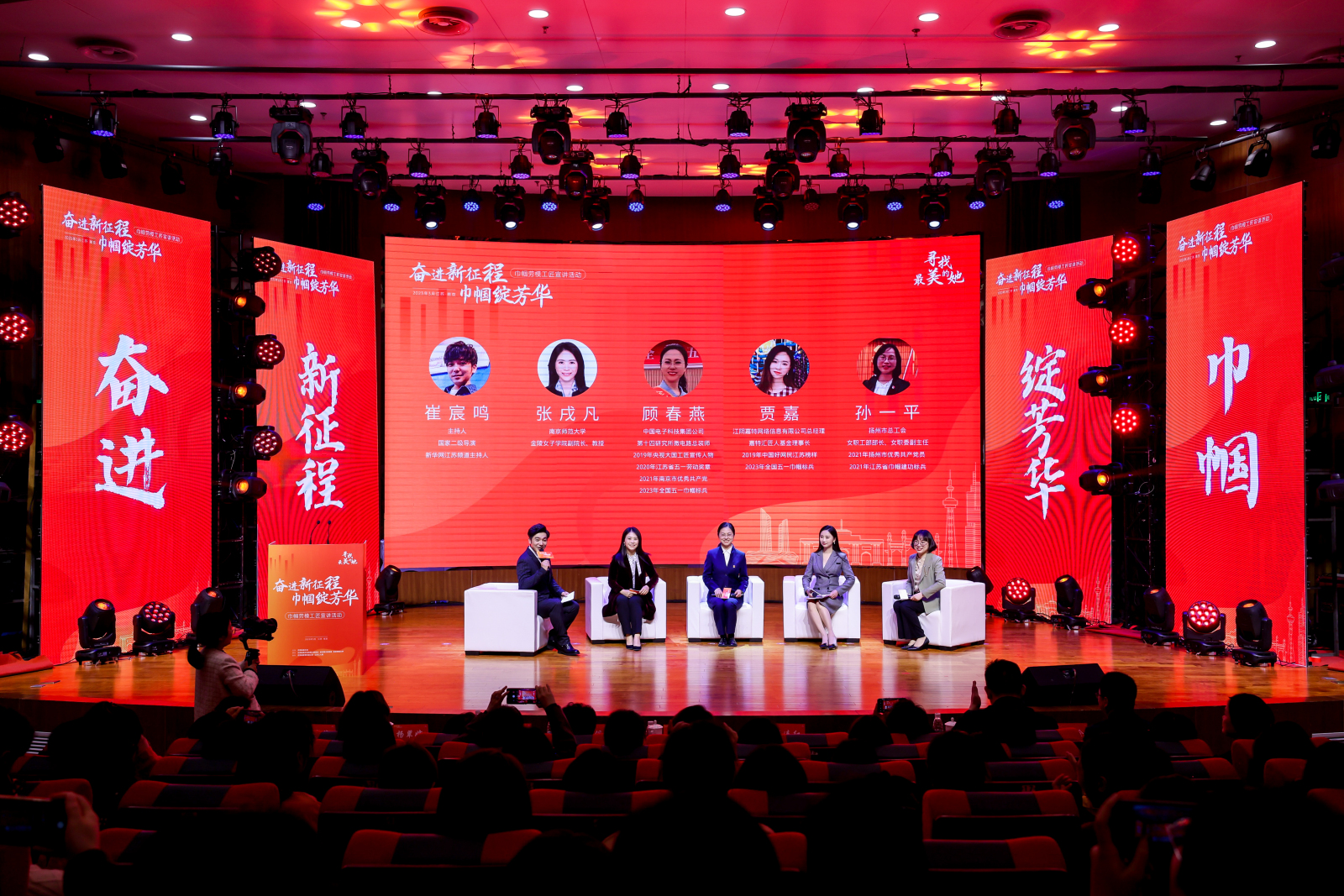 四位巾帼劳模工匠以演讲的形式讲述她们的感人事迹。中国电子科技集团公司第十四研究所微电路总装师、2023年“全国五一巾帼标兵”顾春燕讲述了她怀着对军工事业的热爱,与尖端装备的生产制造结缘和她所理解的工匠精神;中国电子科技集团公司第五十八研究所射频与模拟电路研究室主任、2023年“全国五一巾帼标兵”蒋颖丹讲述了她在国产芯片研发岗位上坚守高水平科技自立自强的苦与乐;江苏聚润纺织科技有限公司倒筒车间主任、2021年“全国五一巾帼标兵”房娟以《青春因磨砺而出彩 人生因奋斗而升华》为题,讲述了她从学员到班长再到质量主管的成长历程;江阴嘉特网络信息有限公司总经理、2023年全国五一巾帼标兵贾嘉作为新业态代表,讲述了她用小小的毛线带动更多姐妹就业,带动传统编织飞向互联网、编织出彩人生的创业故事。宣讲结束后张迎春、施郁佩和张连红等领导为宣讲劳模巾帼劳模颁发聘书。