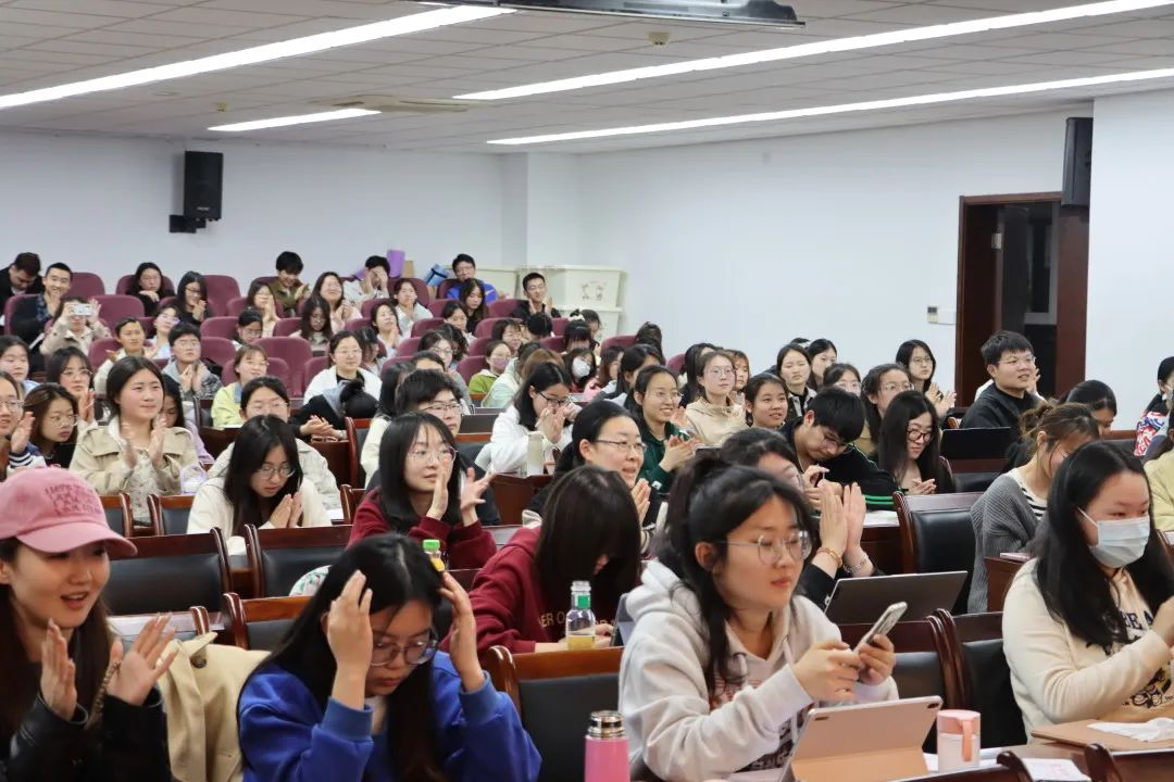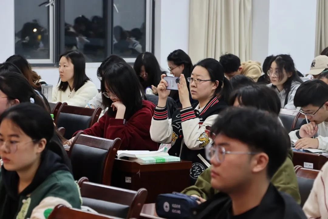 高峰教授对《满庭芳》与《临江仙》两首诗歌的吟诵更是将现场气氛推向高潮。中国诗词吟诵历史悠久,是中华民族珍贵的文化瑰宝,具有很强的文化价值、艺术价值、思想价值。高峰教授的吟诵音调优美、衔接得当、运转自如,既能传形又能传神,使听众自然而然地借此走进传统诗词,从而陶冶情操,培养美感,丰富思想,增长知识。不少同学不禁拿起手机记录这精彩的时刻,现场氛围十分热烈。