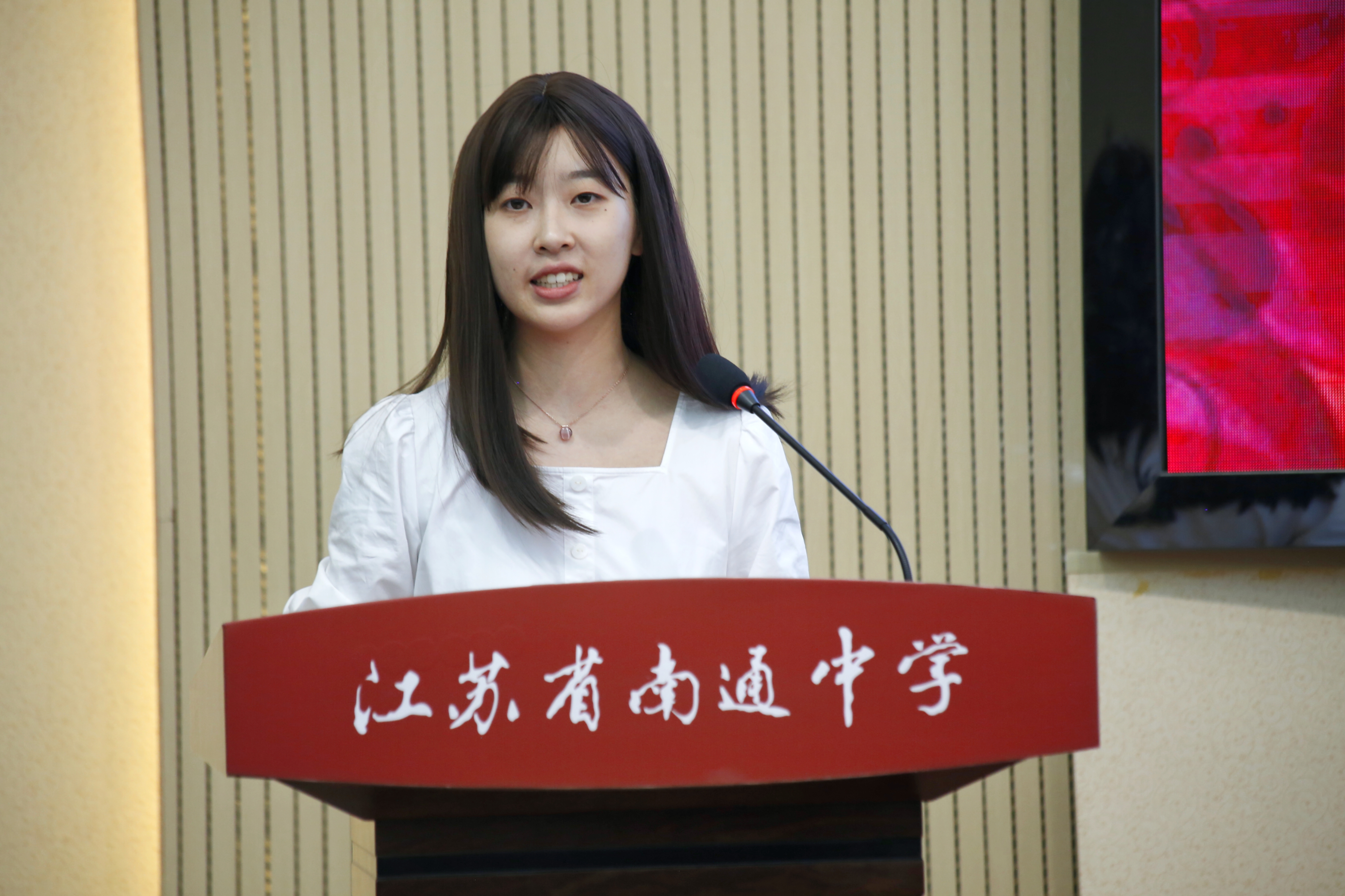 南京师范大学新生代表、南通中学蒋燕昭同学发言。带着激动的心情,她感谢了南师大老师亲赴通中颁发录取通知书,以及通中老师对同学们多年来的培养。她表示是母校教会同学们“诚于做人,恒于学问”,培养同学们走上了更大舞台。未来,他们将传承两校优良传统,努力成为国家栋梁。