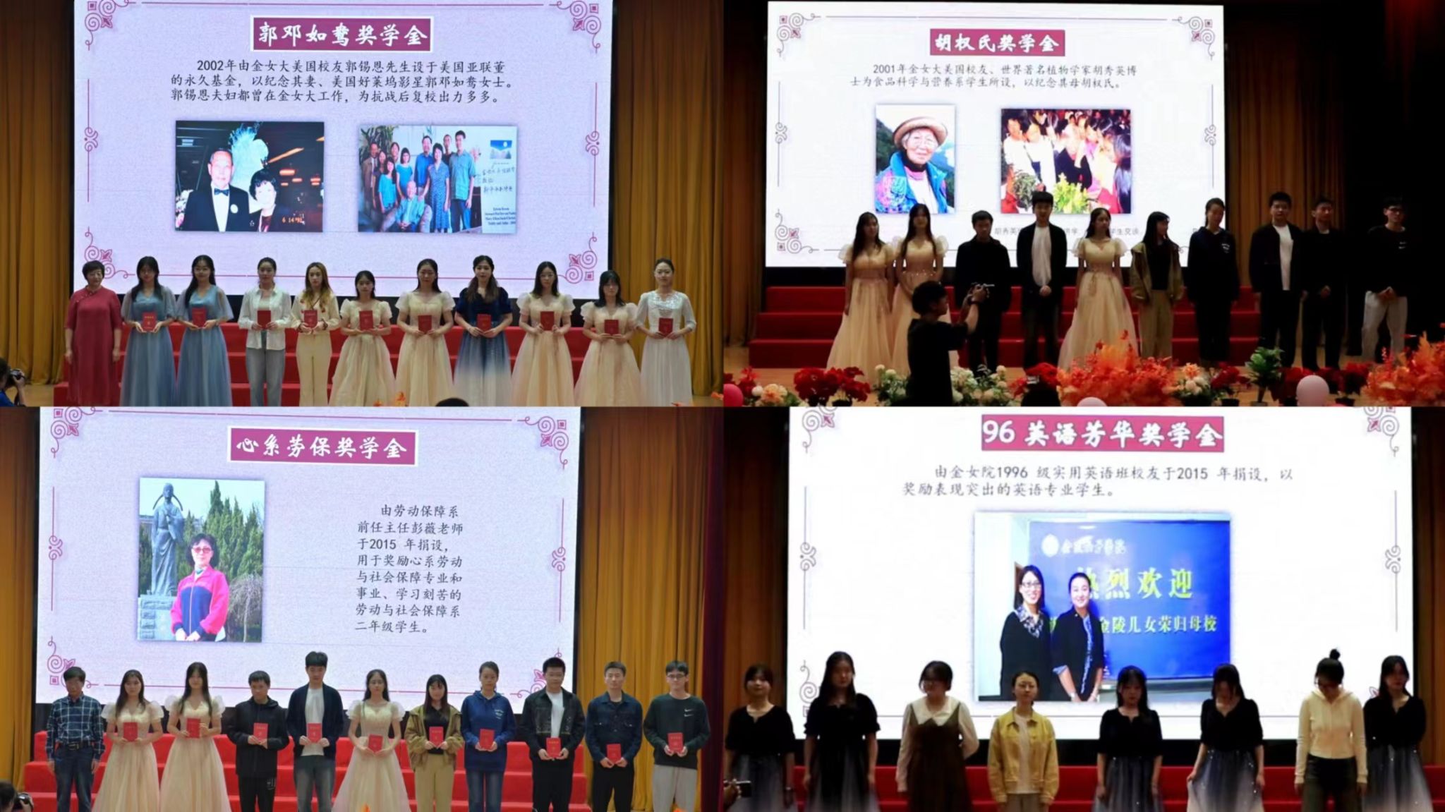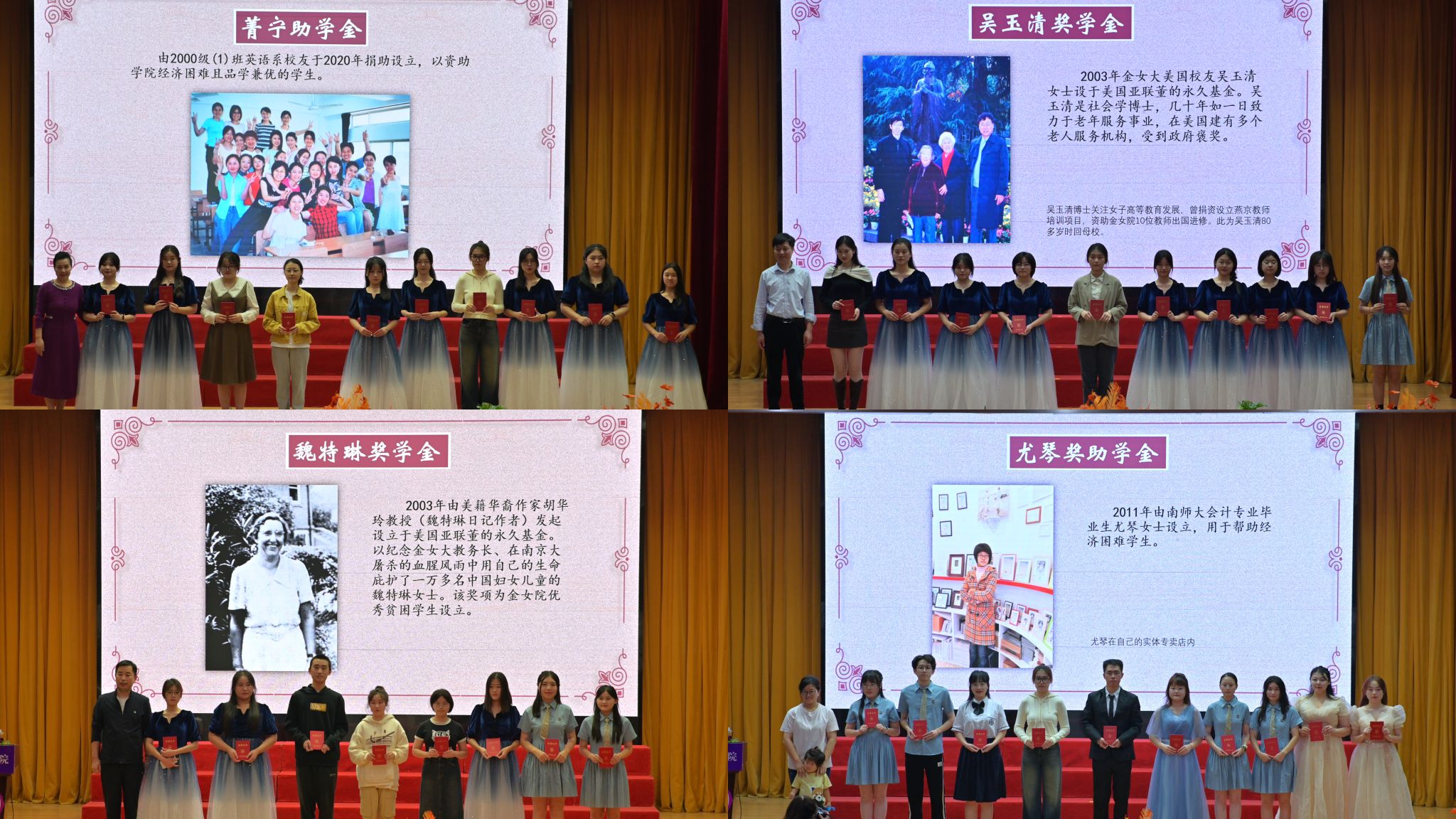 院长边霞宣读奖助学金表彰决定,本年度共有本研学生159人次荣获11项奖助学金。金女大南京校友会名誉会长王韵芳,金女大南京校友会常务理事石尧,博彩网址大全