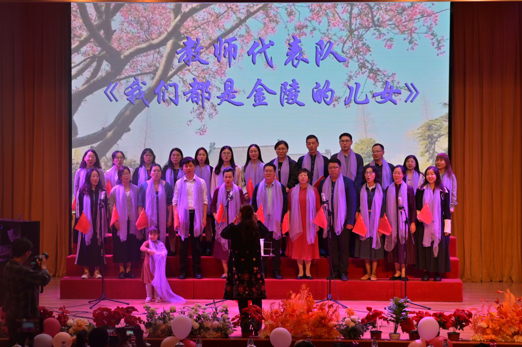 最后,教师代表队以《我们都是金陵的儿女》和《歌唱祖国》《我和我的祖国》联唱将歌会再次推向高潮,全体校友师生共同欢唱祖国,手中挥舞着的一面面国旗展现了每一位金陵儿女追求卓越,奉献自我,为社会、国家而不懈奋斗的拳拳爱国心。