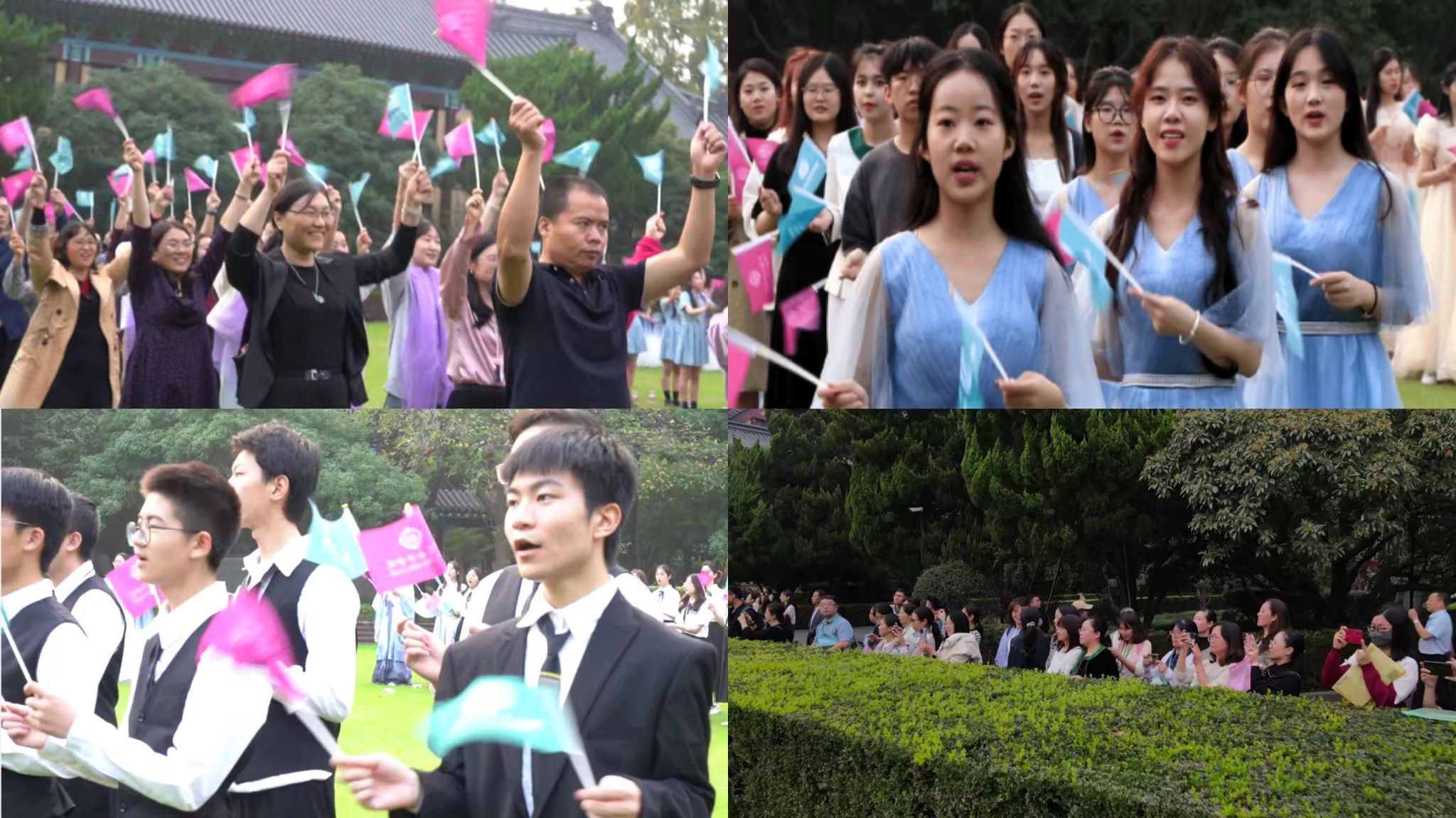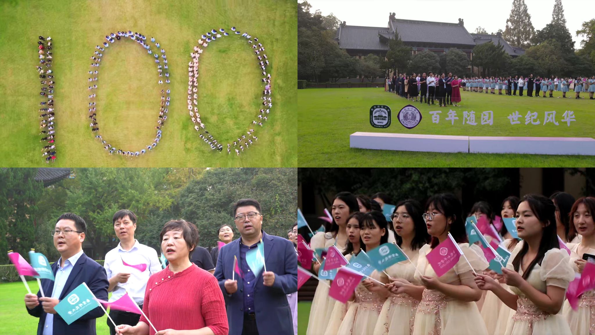 院旗并逐渐组成“100”字样的队形,共同唱响《我们都是金陵的儿女》和《We are from Ginling》这两首承载着金陵女子大学历史的歌曲,抒发着金陵儿女对学校的无限热爱与眷恋。快闪活动引得路过师生纷纷驻足观看、拍照记录,体现了百年随园厚重的历史传统和文化血脉,也为学校“厚生”文化、爱校荣校文化等校园文化建设注入新活力。