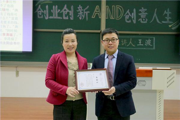 在讲座的最后,杨素萍老师给王波老师颁发感谢状,感谢王老师为同学带来的精彩的讲座,同时感谢王老师对“女大学生素质证书”项目的支持与贡献。杨老师鼓励同学们以全新的视角来看待大学生创业创新,希望同学们能够把握机会,在青春年华遵从内心的选择,丰盈人生。