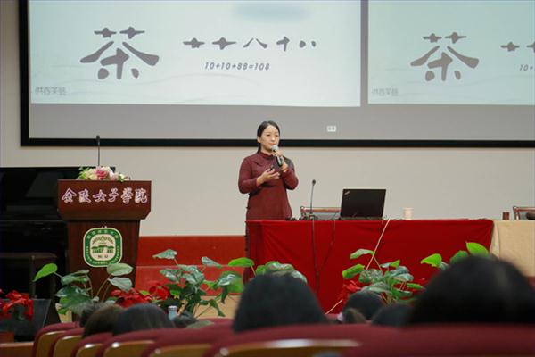 随后,黄老师把茶与养生紧密相连,为大家介绍了茶的养生功效。茶为中心,益于肝、肺、脾、肾,并有少睡、止渴生津、清热解毒、消暑安神的功效。同时,茶兼具有愉悦心情、延年益寿的功效。她还指出:“天造茶字蕴道深。古人造字的时候似乎就把茶中的养生之道蕴含在字中。古时的茶字左右对称,对称意味着协调,协调意味着美。茶是开放的,茶性之包容让人亲近。”黄老师耐人寻味的讲解使大家体味到了茶浓浓的“禅”味。