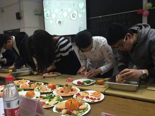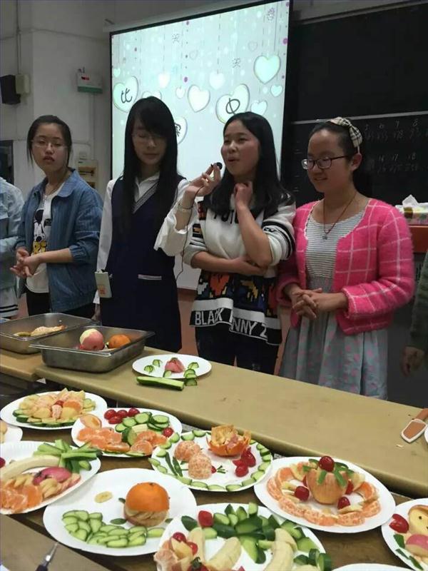 本次活动吸引了来自教师院、化科院及外院等全校各院系队伍的积极参与。除此之外,来自各院的众多男生也积极参与其中,在包馄饨、水果拼盘等环节都展现出了不俗的实力。比赛中,最吸引人眼球的莫过于群英翡翠水果拼盘。各种新鲜的水果在同学们的手中都成为创造“美”的素材。“金缕7+1队”打破常规,创新性地设计出立体拼盘苹果花,并以柑橘作为修饰,令人眼前一亮;而最后一组带来的孔雀则以黄瓜为羽,再以番茄点缀,色彩鲜艳,引人注目,也寄托了制作者希望每个女生都拥有追求美丽的勇气的美好愿望。
