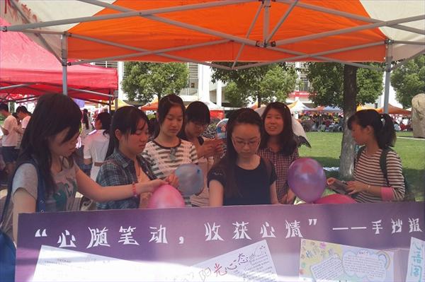 中午时分,活动还未开始,心站的成员们已积极地挂起了横幅、竖起了展板。经过各院心站成员的细心布置之后,活动便如火如荼地开始了。每个院的心站都推出了自己独具特色的活动,我们院更是推出了“光影流年 心影相随 感动我的电影瞬间专题展”、“心随笔动 收获心情手抄报专题展” 、“展露你的微笑,温暖你的心扉”——寻找最美丽的笑脸”三块展板,精致的展板吸引了众多路人的目光。此外我们院挤破气球答题的活动也受到了老师同学们的热烈欢迎。一张张印有题目的小纸条被巧妙地放置于气球之内,随着“啪”的一声,纸条也随之飞出。只要答对问题,就能获得糖果书签等奖品,奖品虽小却还是很是精致的。在活动过程中,不少老师和同学都心怀好奇地来参加了这次活动,来为同学们的活动加油打气,并对同学们的创意给予了肯定,指出活动中需要注意的问题,同时也对博彩网址大全
