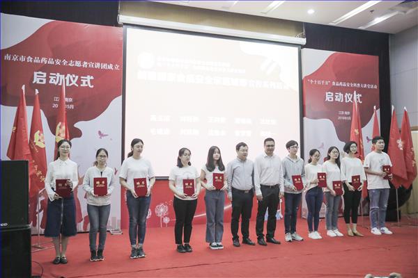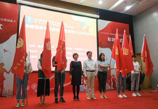 南京市食药监局副局长华文、南京师范大学副校长孙友莲亲自为志愿者团队授旗;团市委副书记石磊等为志愿者代表发放聘书。志愿者们宣誓,将弘扬“奉献、友爱、互助、进步”志愿者精神,恪守文明道德,承担社会责任,让食品药品安全科普知识走进千家万户。为实现南京创建国家食品安全示范城市努力奋斗!