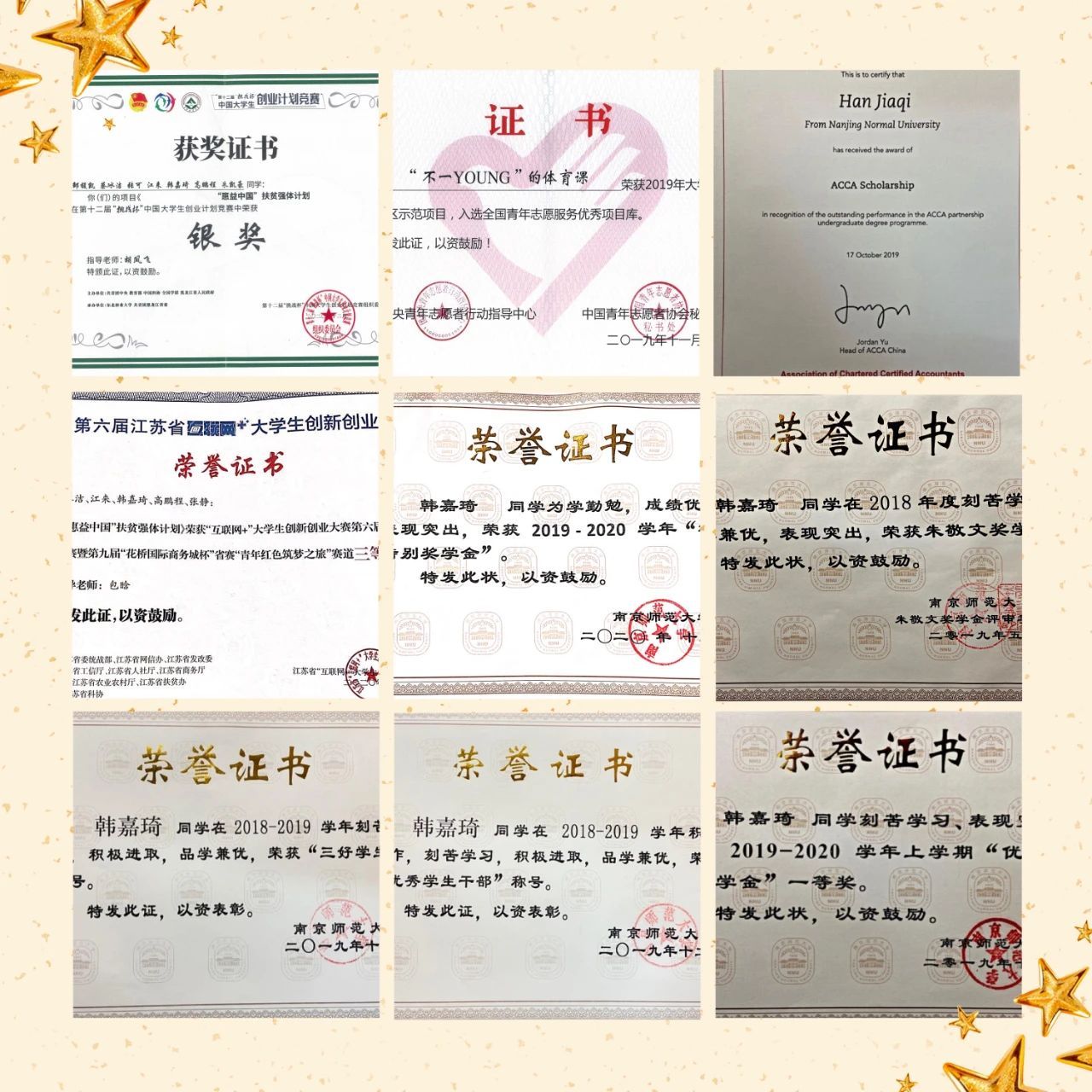在学习中,韩嘉琦同学脚踏实地,勤勉好学,大一大二,课程紧凑,每天的课程结束,她能自觉前往图书馆,复习课内知识,完成课后作业。周末假期,除了基本的课内学习,她还积极报考了ACCA,也成功在大二学年取得初级会计职称。大三大四,课程数量减少,她也并未懈怠,利用假期积极参与会计师事务所的实习,努力将所学付诸于实践。总结四个学年的学习生活,韩嘉琦同学共有33门课程获得90分以上的成绩,曾获得校优秀学生一等奖学金5次,二等奖学金1次,也曾荣获南京师范大学校长特别奖学金、朱敬文奖学金等荣誉,这些荣誉也给了她继续坚持下去的动力。在大四,她以班级第一的成绩保研,并成功拿到了东南大学研究生的保送资格,为她四年努力的学习生活画上了圆满的句号。