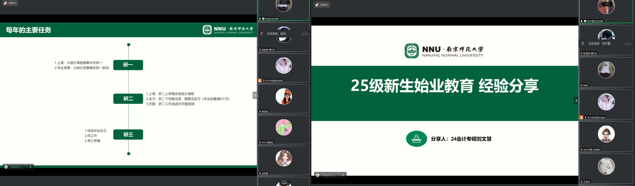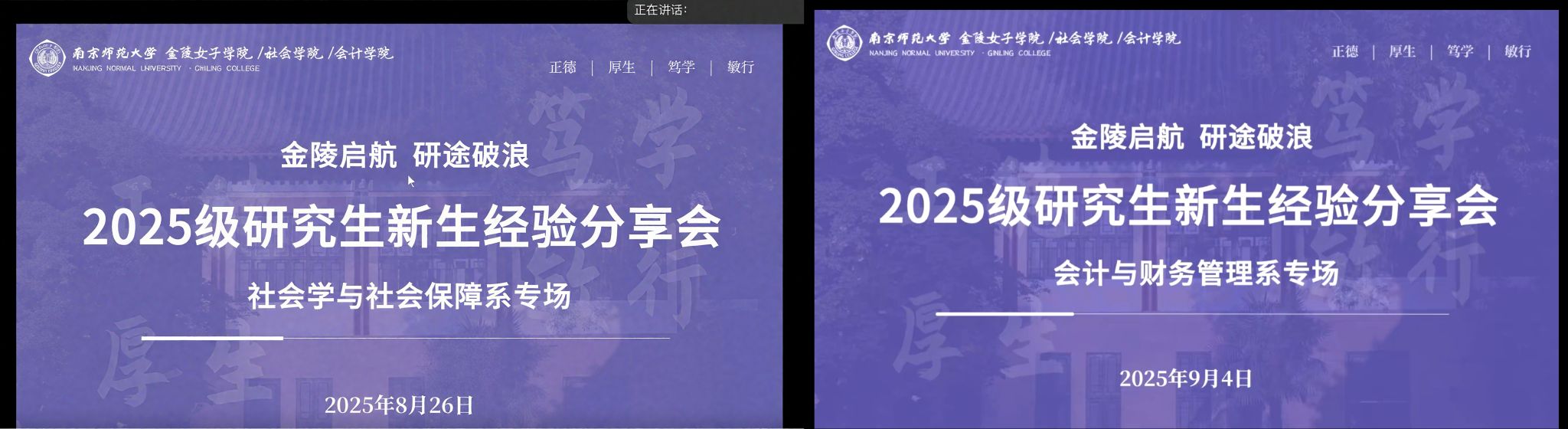 /社会学院/会计学院分别于2025年8月26日和9月4日晚7点举办了以“金陵启航 研途破浪”为主题的2025级研究生新生经验分享会。本次经验分享会设有社会学与社会保障系专场和会计与财务管理系专场,分别邀请了各专业研究生代表进行经验分享,内容涵盖科研实践、竞赛参与、职业规划、学生工作等多个方面,为新生提供了宝贵的研途指引。